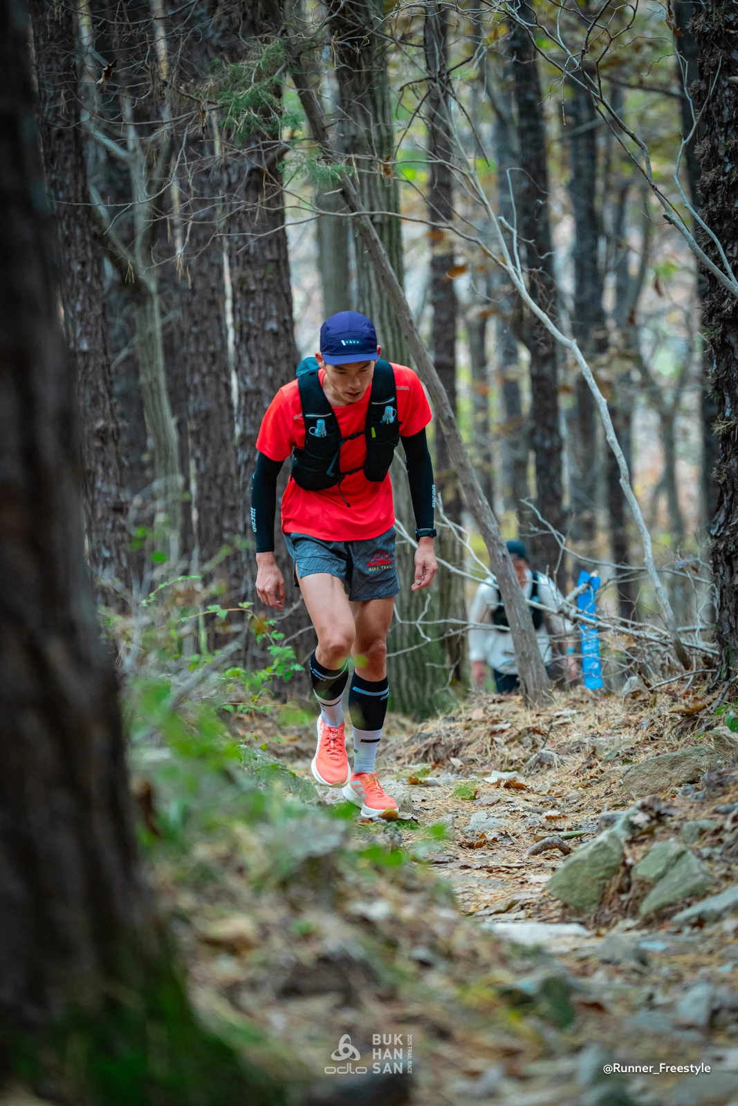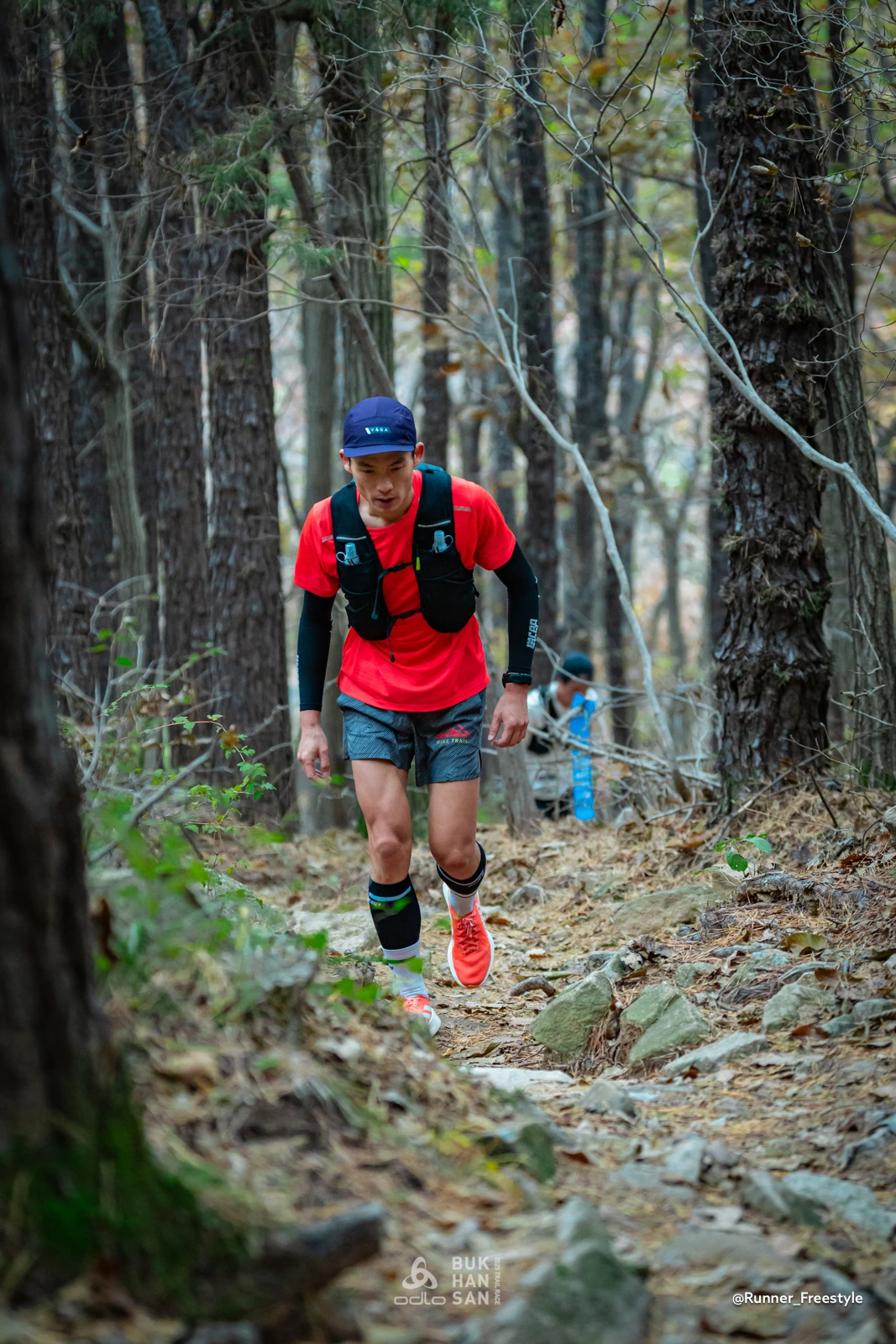 - 40km 지날 즘 산길이 아닌 평창동 대저택 주택가 아스팔트 도로를 지난다. 오르막과 평지는 괜찮지만 내리막에서는 (내 다리가 모두 고장 났던 탓에) 똑바로 내려올 수 없었다. 결국 뒤돌아서서 거꾸로 뛰어 내려왔다. 근육 경련 발생되면 무조건 기권(DNF) 해야 할 것 같은 느낌이라 조심했다. 아슬아슬했다. 다행히 트레일런은 몸 상태가 안 좋은 것 같으면 잠깐 속도를 줄이고 걸으면서 회복할 수 있다. 잠깐씩 회복하며 겨우 살렸다.