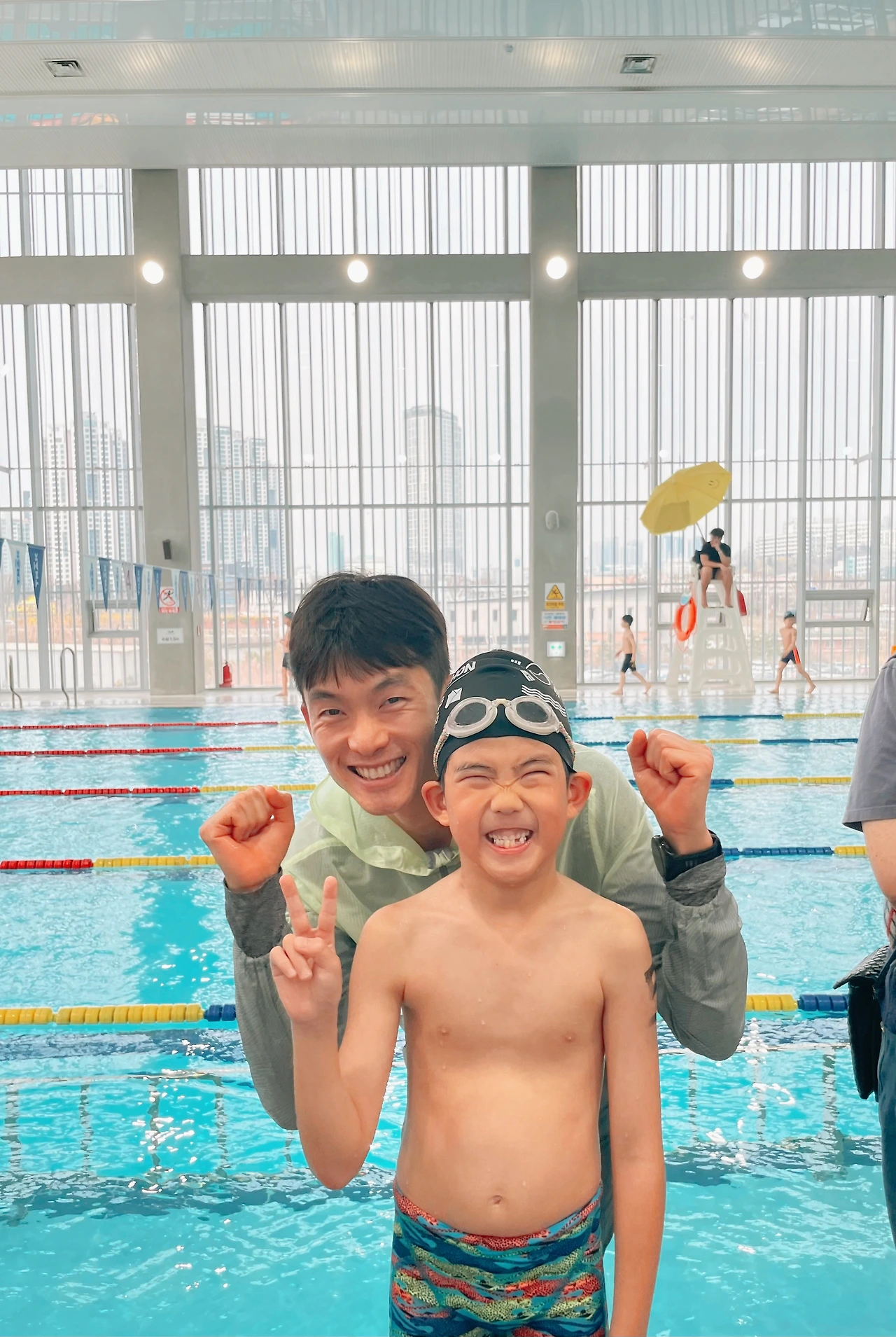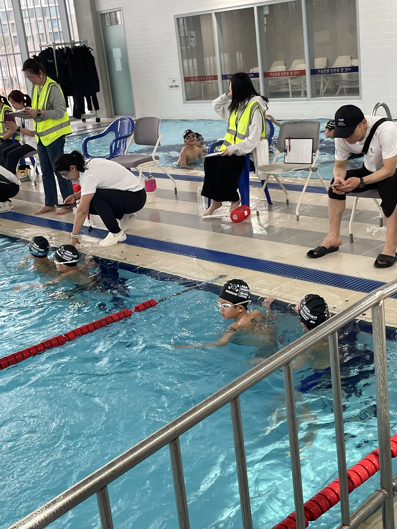 예상보다 많은 참가 인원을 보고 아내와 나는 겁먹었다. 어린이 수영 팀에서 선수 같은 아이들이 죄다 나오는 건 아닐까? 우리 아이처럼 동네 수영장에서 물놀이 수준으로 하다가 ‘엄빠‘에게 떠밀려 나온 애들도 있긴 한 건지 궁금했다. 혹시라도 애 주눅 들까 봐. 다행히(?) 다양한 애들이 있다. 선수처럼 빠른 애들도 있고 ‘물놀이‘ 애들도 있고.