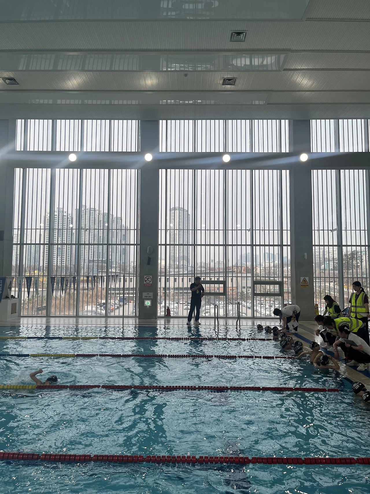 성동구철인3종협회장배 아쿠아마라톤 대회에 다녀왔다. 서울숲복합문화체육센터 수영장은 처음인데 새 건물이라 모든 것이 반듯하고 깨끗하고 시설을 이용하는 사람의 마음조차 기분 좋은 곳이었다. 다만 이런 ‘대회’를 감안한 수영장은 아니기 때문에 별도 관람 시설은 없다. 지인이나 동료, 가족들은 경기를 보기 위해 맨발로 레인 옆에 서서 지켜봐야 한다.