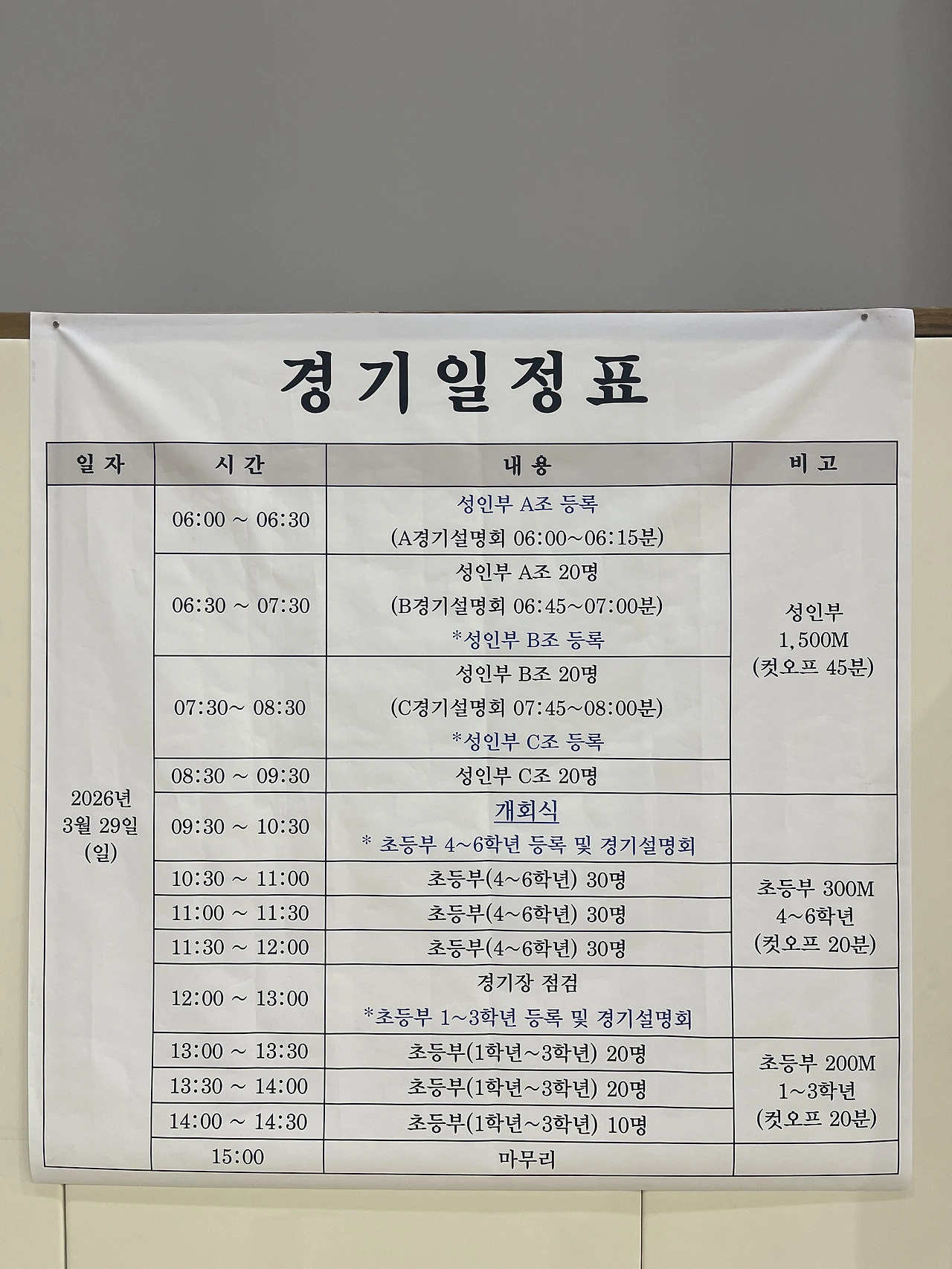 대회 종목: 성인 1500미터 / 초등부 유치부 300미터, 200미터, 100미터