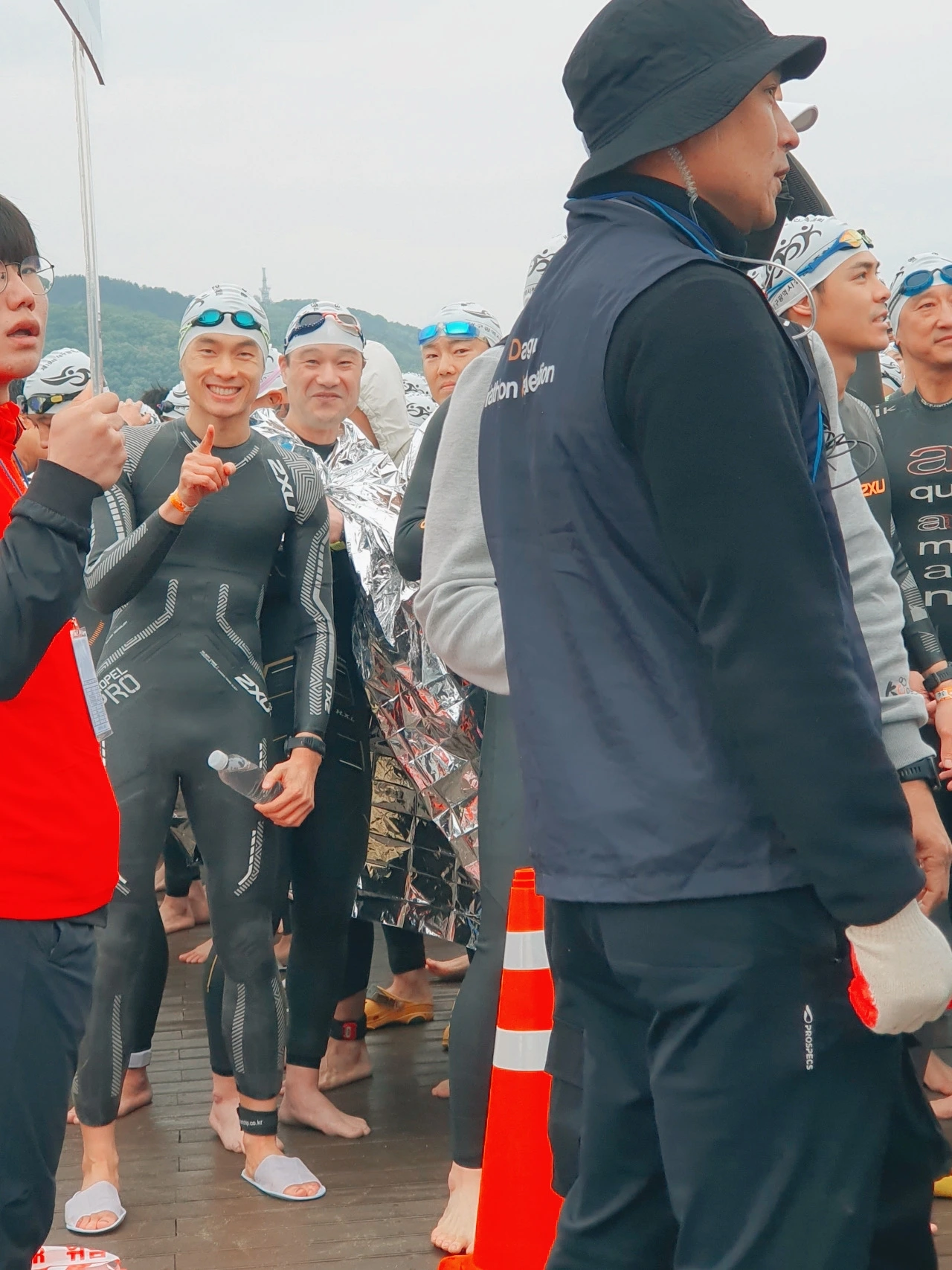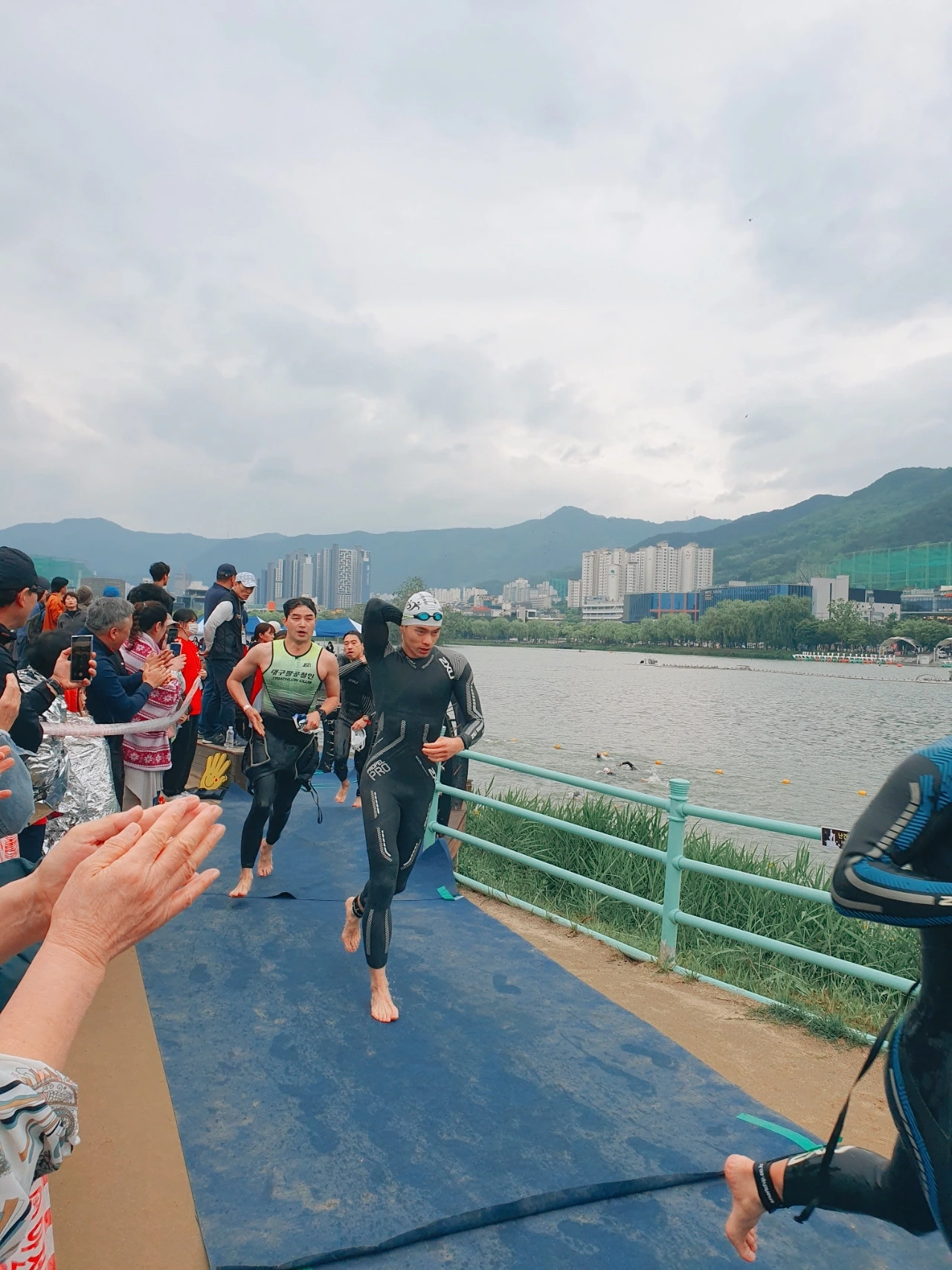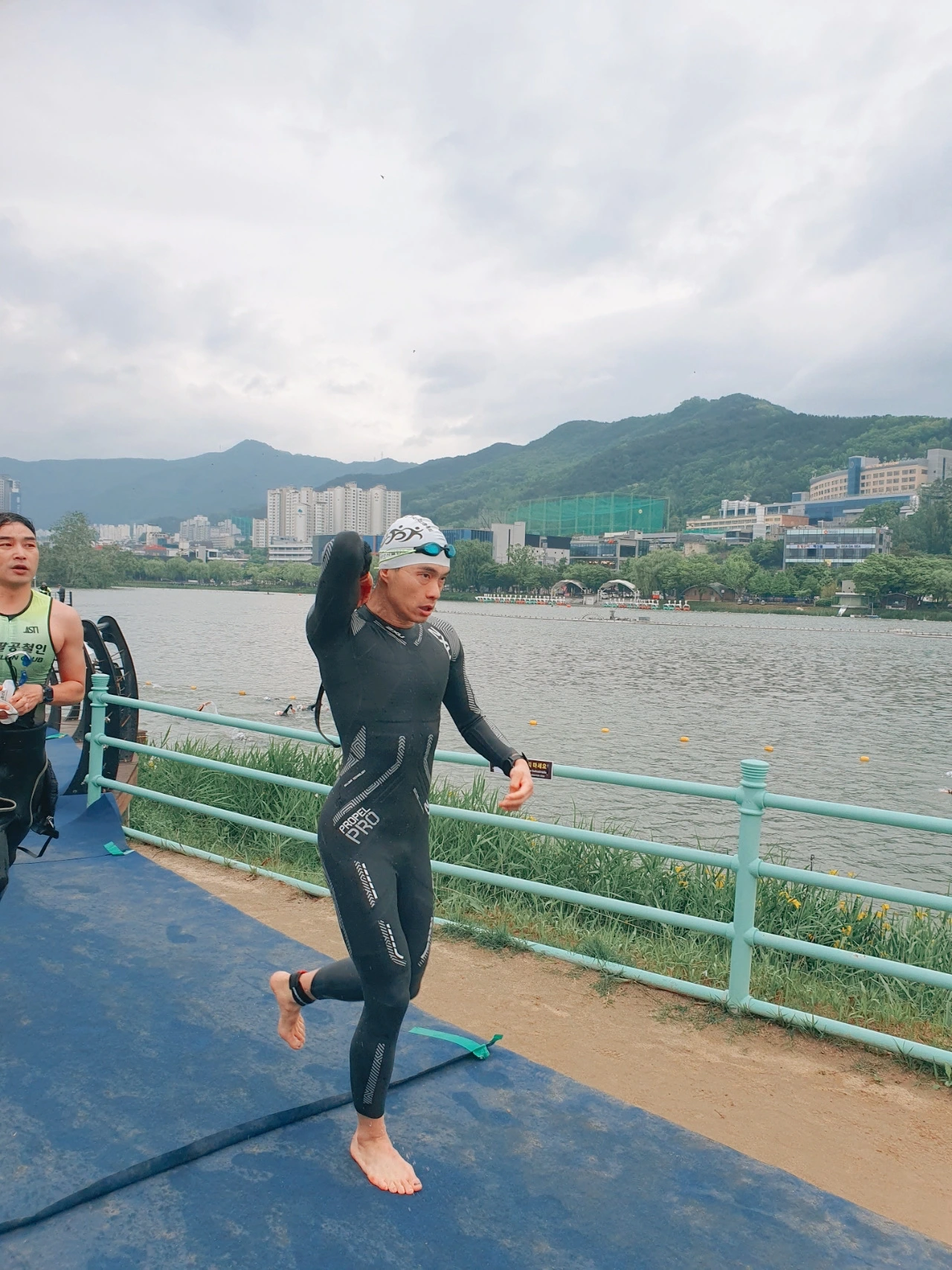 경기 당일 수영 출발 전 식순에 의거하여 개회 행사가 진행될 때 심박을 올리기 위해 산책로를 왔다 갔다 하며 가볍게 달리기를 하였다. 일주일 전 결혼식을 올리신 오픈케어 난나님 그리고 아이언맨크루 회장님인 박선수 님을 만나 인사드렸다. 웜업 달리기를 마치고 출발선을 이동하기 전 수성못 수변무대 데크에 90-90 나인티 나인티 자세로 앉아 팔꿈치에 무게를 싫어 넓적다리와 고관절 대퇴근막장근을 꾹꾹 눌러주며 풀었다. 출발 5분 전, 출발선으로 이동하였다. 오픈케어 하이님과 요요님을 만났다. 서포터로 이번 대회 함께 하는 평쟁님은 인사와 함께 사진을 찍어주었다