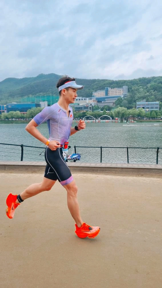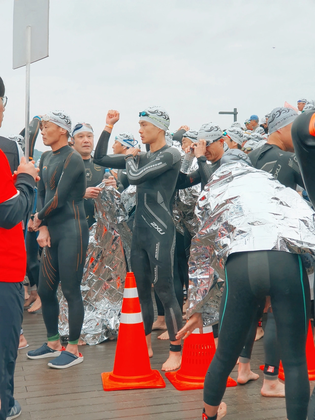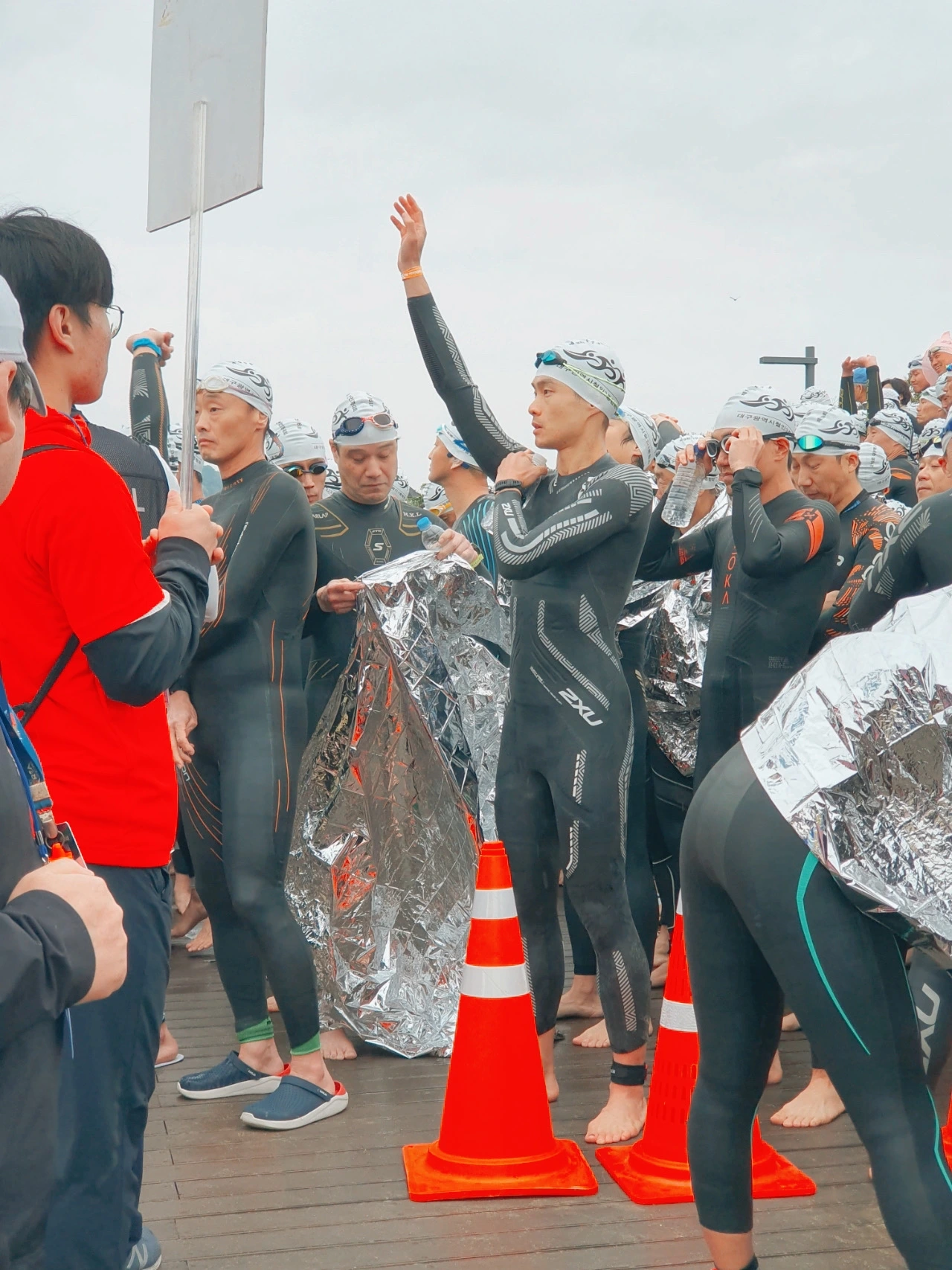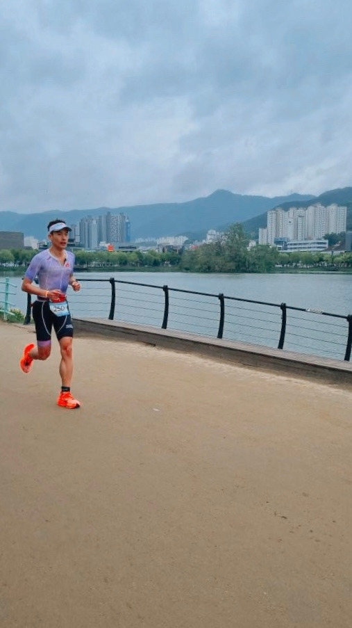 경기 당일 수영 출발 전 식순에 의거하여 개회 행사가 진행될 때 심박을 올리기 위해 산책로를 왔다 갔다 하며 가볍게 달리기를 하였다. 일주일 전 결혼식을 올리신 오픈케어 난나님 그리고 아이언맨크루 회장님인 박선수 님을 만나 인사드렸다. 웜업 달리기를 마치고 출발선을 이동하기 전 수성못 수변무대 데크에 90-90 나인티 나인티 자세로 앉아 팔꿈치에 무게를 싫어 넓적다리와 고관절 대퇴근막장근을 꾹꾹 눌러주며 풀었다. 출발 5분 전, 출발선으로 이동하였다. 오픈케어 하이님과 요요님을 만났다. 서포터로 이번 대회 함께 하는 평쟁님은 인사와 함께 사진을 찍어주었다