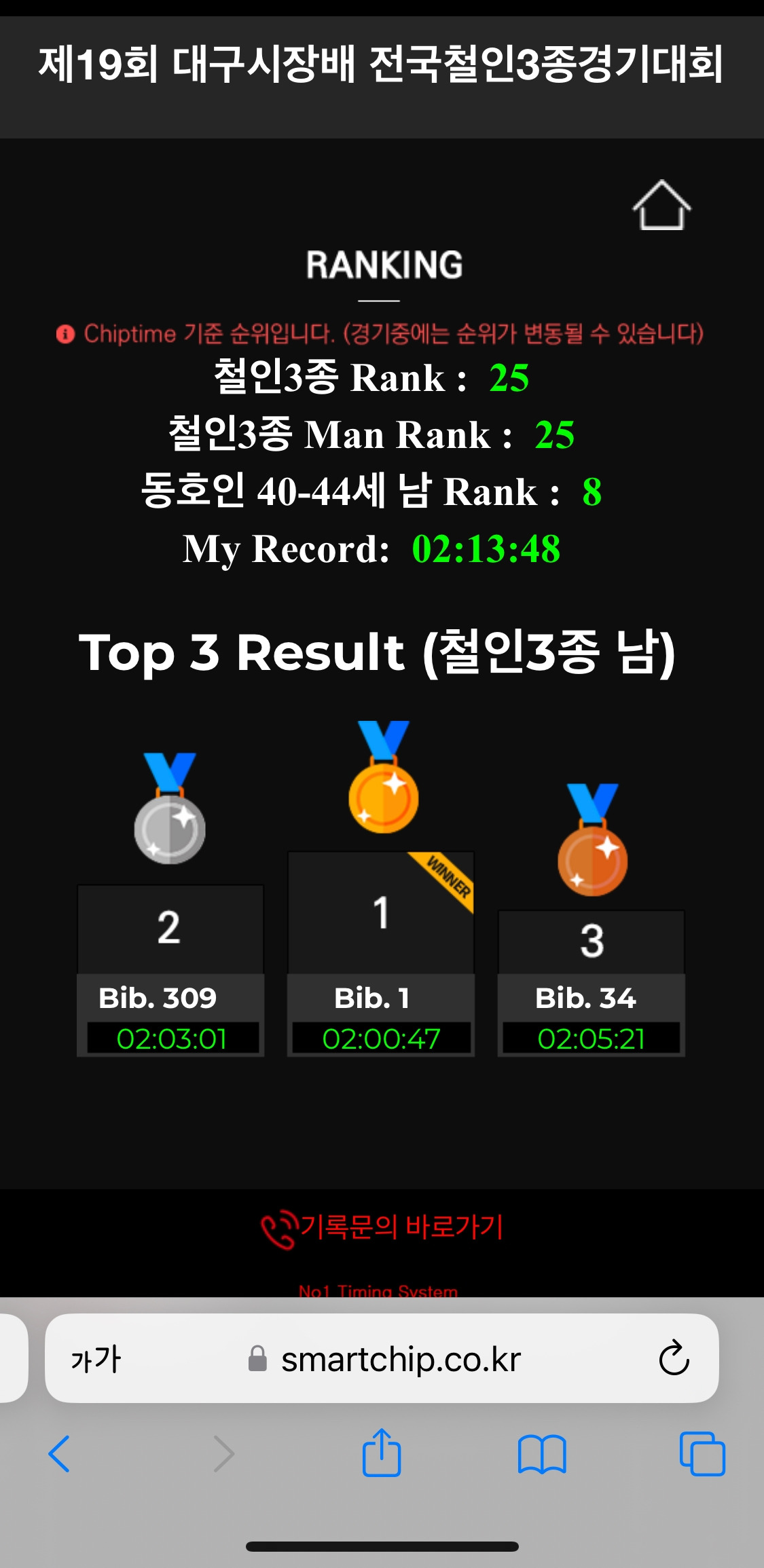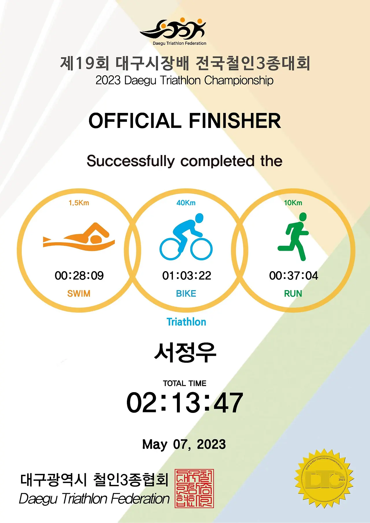 상대적으로 거리가 짧은 표준거리(수영1.5km 자전거40km 런10km) 종목에는 강자들이 많다. 그 강한 분들의 대부분이 나와 같은 연령 에이지 그룹에 모여있다. 순위권은 참가신청한 선수 구성 운이 따라줘야 한다. 우선 목표는 2시간 10분 이내이고 운이 좋으면 순위권 그렇지 않으면 어쩔 수 없다 생각했다. 결과적으로 2시간 13분을 넘겨버려 순위권에서도 많이 밀렸다. 작년에도 2시간 13분대 9등 정도 했던 것 같은데, 이번에도 2시간 13분대 8등을 하였다. 그것보다 더 마음이 무거운 건 전체 인원에서 나보다 앞서는 분들이 24명이나 있다는 것이다. 취미라도 진심을 다하면 경쟁과 승부에 남녀노소를 가리지 않게 된다