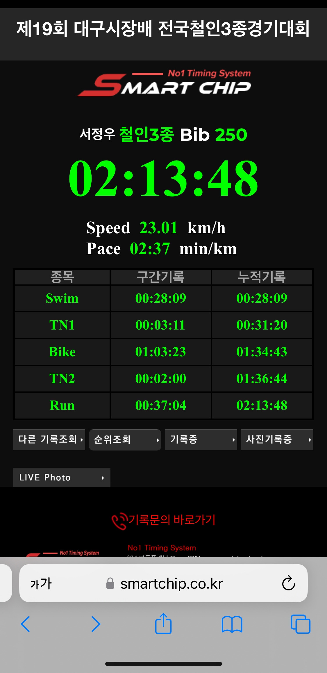 시계를 확인했다. 2시간 13분 48초. 굉장히 분하고 아쉬웠다. 이번에는 2시간 10분 이내의 목표를 달성할 수 있을 것이라 생각했는데, 역시 3종 대회는 매번 내 마음 내 뜻대로 되지는 않는다