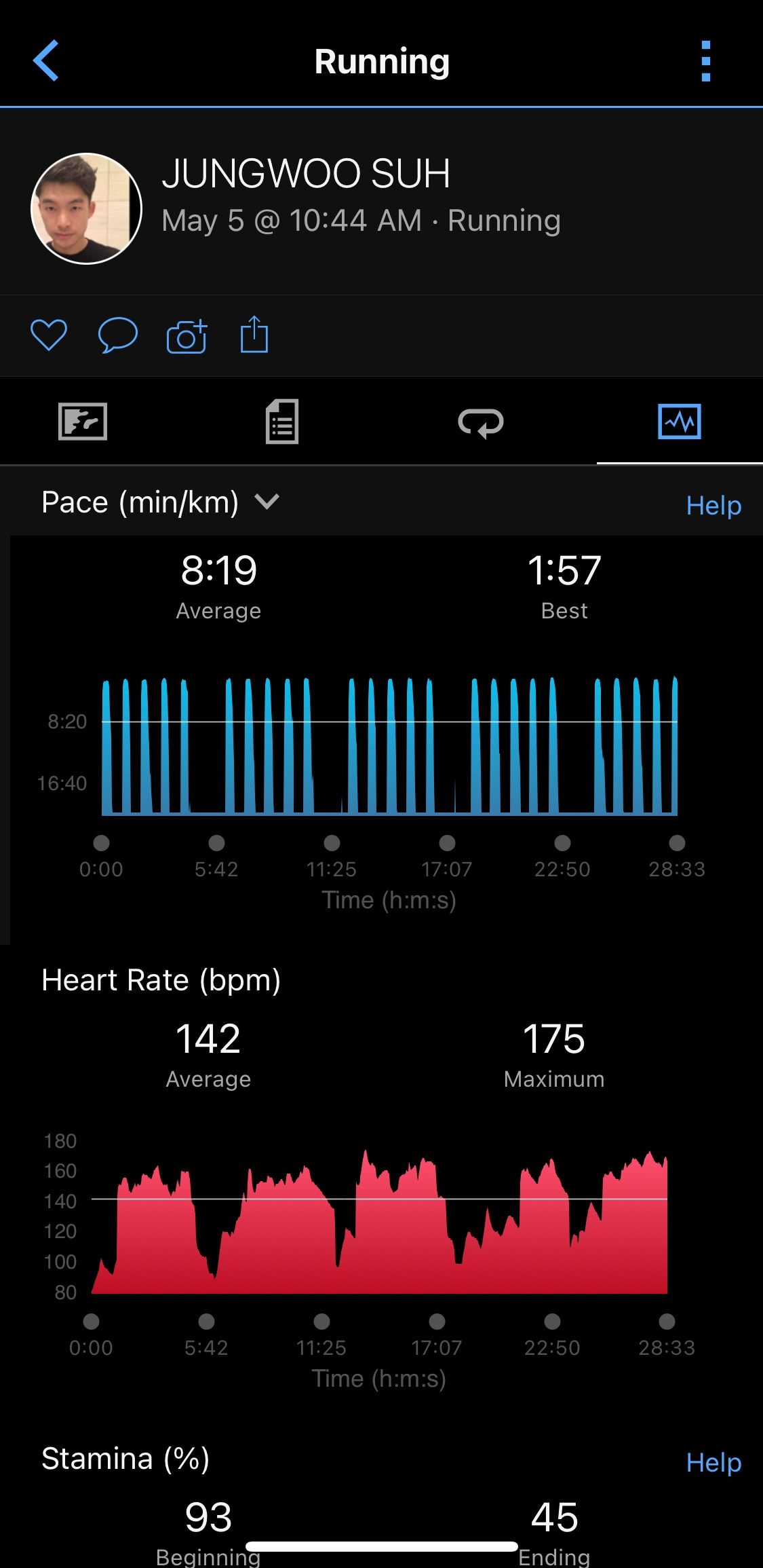 웜업이지와 대회페이스 100m 반복을 섞어가며 총 거리 1000m 정도 수영을 하고 온천에서 온냉탕 반복으로 몸을 풀어주었다. 전날 어린이날 아침에 처가 근처 계명대 트랙에서 100m 16초 + 제자리 휴식 44초의 1분 싸이클로 25회 반복하며 달렸던 탓에 하체 근육이 조금은 묵직했기 때문이다