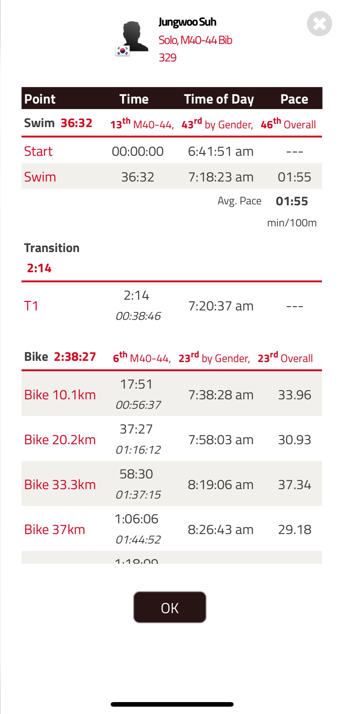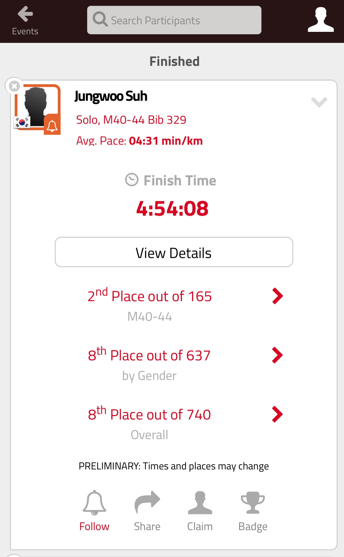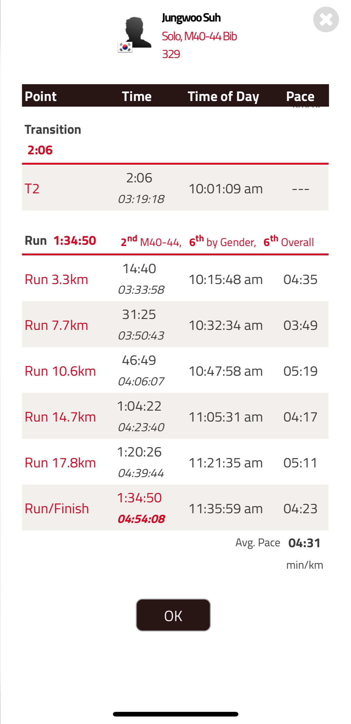 경기를 마치고 맡겨두었던 기어백을 찾아 가장 먼저 아내와 아이에게 전화하였다. “여보, 나 2등 했어. 제우야, 아빠는 끝까지 포기 안 했고 최선을 다 했어. 공룡 받아갈게. 사랑해.”