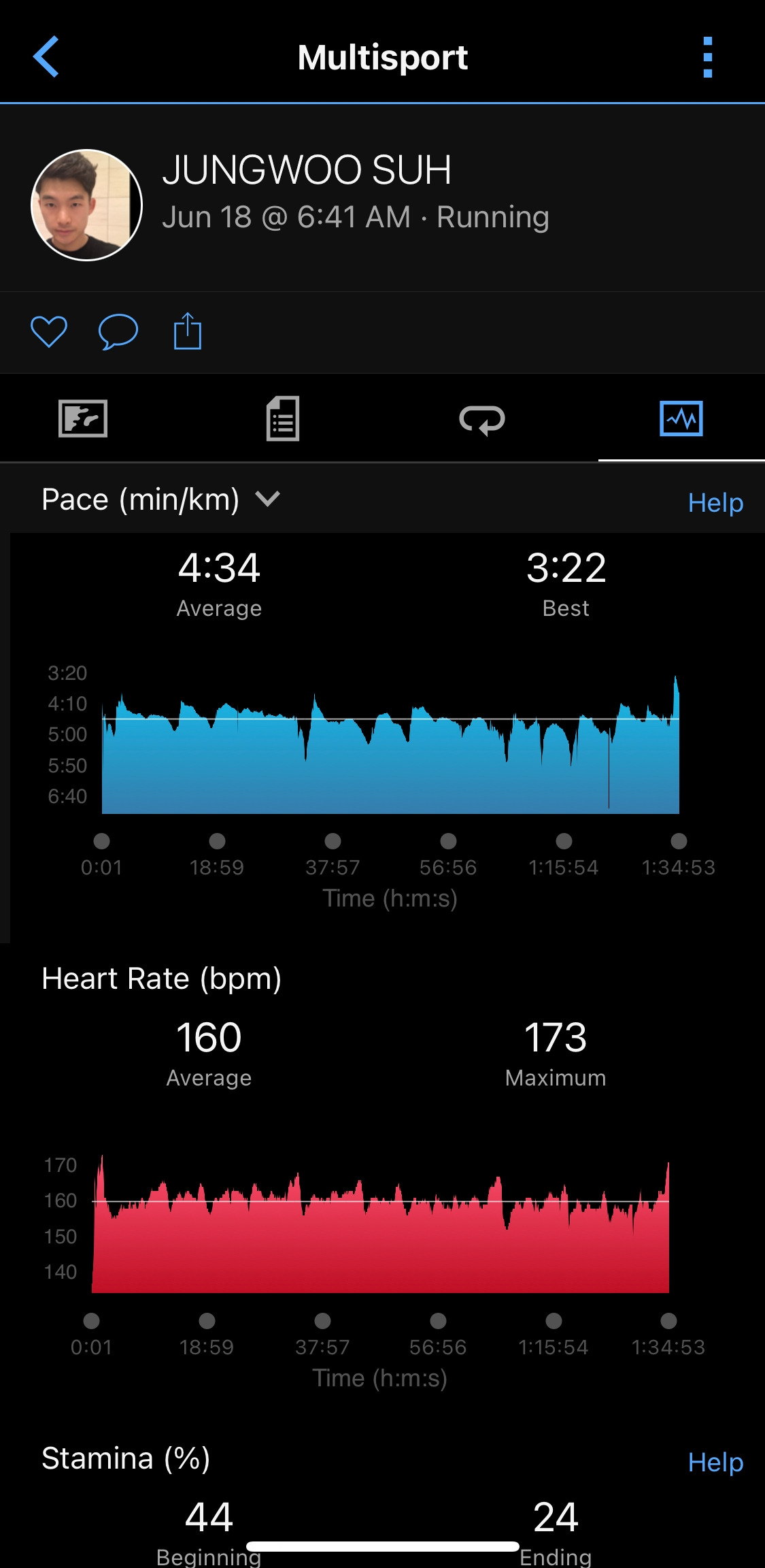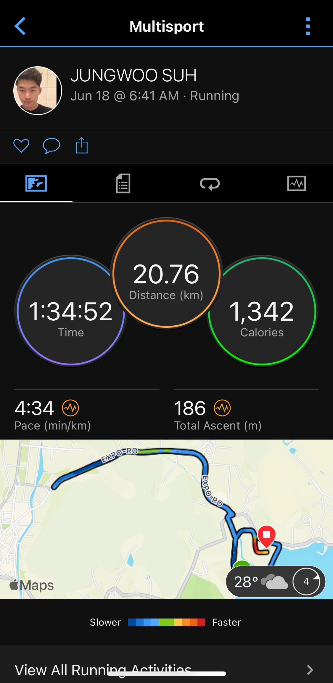 같은 구간을 3회전하는 코스인데, 작년에는 마지막 3랩에서 페이스를 올렸었다. 하지만 올해 대회에서는 마지막 랩에서 좀처럼 속도를 올리기 힘들었다. 사이클과 마찬가지로 더위와 2주 전 킹코스 완주 여파인 듯하다