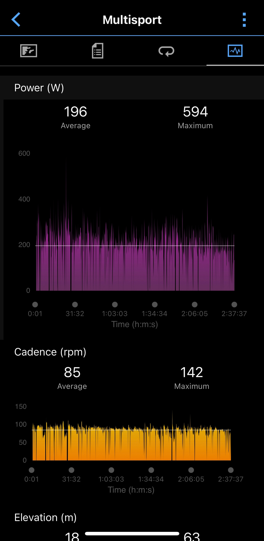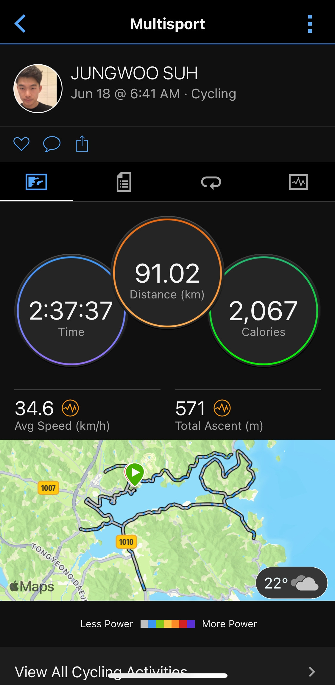 랩파워 200W 목표로 경기를 운영하였다. 개인적으로 사고 경험도 있어 사이클을 가장 무서워하기 때문에 내리막에서 속도를 크게 올리지 못한다. 오르막에서는 다른 선수들을 추월하고 내리막 평지에서는 추월당하는 경기가 계속되었다. 목표 랩파워는 달성했지만 기록은 수영과 마찬가지로 작년보다 느려졌다. 날씨와 바람 때문일 수도, 아니면 2주 전 군산 킹코스 완주 후유증 때문일 수도 있다