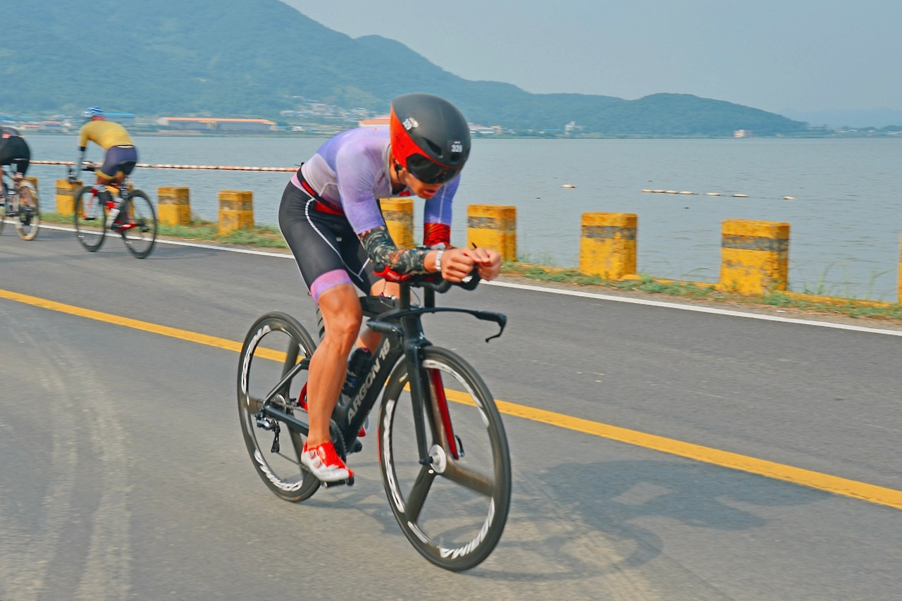 실수가 있었다. 사이클 핸들 위에 거치해 둔 헬멧을 들어 올리는 과정에서 핸들에 부딪히며 바이저를 떨어뜨렸다. 헬멧에 부착하는 바이저가 마그네틱 자석 방식이라 다행히 부러지지는 않았지만 순간 당황하였다. 우선 헬멧을 쓰고 바이저를 부착하자는 생각에 서둘러 헬멧을 썼는데 머리에 들어가질 않는다. 너무 당황한 나머지 수모와 수경을 벗지 않았던 것이다. 뒤늦게 수모와 수경을 벗어 바구니 백에 담고 다시 헬멧을 쓰고 바이저를 부착하였다. 핸들바에 거치한 사이클링 컴퓨터 전원을 켰다. GPS워치로도 실시간 기록을 측정하고 있지만 별도의 사이클링 컴퓨터는 필수다. 애어로 포지션을 유지한 채 가장 보기 편하고 좋은 위치에 미리 거치해둬야 하고, 무엇보다 랩파워를 실시간 체크하며 내 다리로 소비하는 파워를 확인해야 하기 때문이다