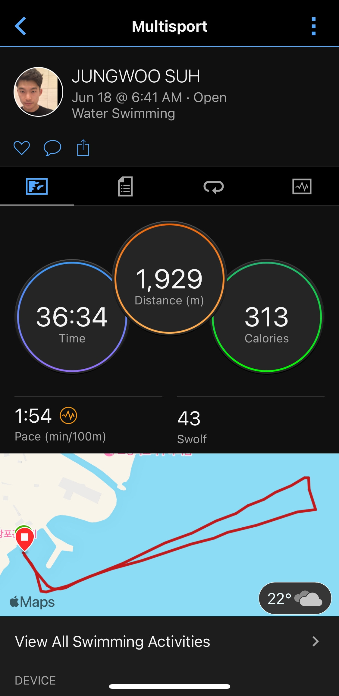 5초 간격의 롤링 스타트 방식이었다. 7~8번째 줄 정도에서 대기 후 출발하였다. 스트로크를 힘차고 빠르게 돌리는 것보다 스트로크 처음부터 마지막까지 물을 놓치지 않는 점에 집중하였다. 다른 선수의 스트로크 박자와 리듬보다는 나 자신이 물을 놓치지 않고 팔꿈치가 뒤로 빠지지 않을 수 있는 스트로크 속도를 유지하고자 하였다. 연습 때는 감각이 좋았고 대회 당일 수영 종목 진행 중일 때에도 감각이 좋았다. 하지만 수영을 마치고 나와 GPS워치 기록을 확인했을 때 36분대인 것을 보고 허탈했다. 작년 기록보다 더 느려졌던 것이다. 이번에는 몸싸움도 크게 없었고 경로 이탈 등의 실수도 거의 없었는데 기록이 좋지 않아 역시 아쉬웠다
