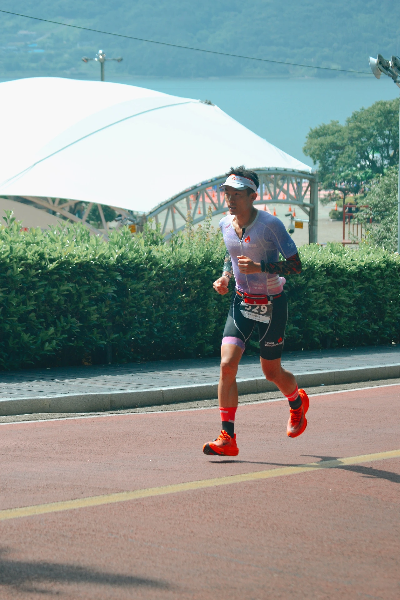 알파플라이 2 신발에 미리 스트라이드 파워미터를 장착해 두었다. 끈은 탄성끈으로 바꿔 준비해 두었다. 신발 밑창에 수분을 흡수하도록 베이비파우더를 얇게 뿌려두었고, 양말 안에도 조금 뿌려두었다. 달리기를 하며 섭취할 보급품과 사용할 미니 파스를 경기복 뒷주머니에 넣고, 선바이저를 머리에 착용하였다. 사이클 마친 다리에 경련이 일어날까 봐 이 과정들을 땅바닥에 앉아서 진행하고 마친 후 다시 일어섰더니 시간 손실이 조금 있었다. 이번 대회 같은 바꿈터 구조에서는 2분 이내로 나왔어야 한다