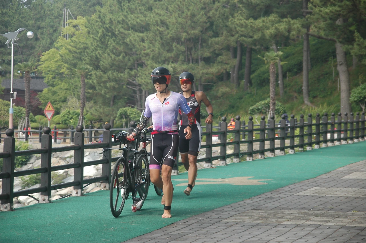 클릿 페달에 미리 장착하고 고무줄로 약간 고정해 둔 사이클링 슈즈는 다행히 잘 매달려 있었다. 사이클 출발선을 지나며 왼발을 먼저 밟고 오른발로 뜀박질하며 사이클을 밀어내며 속도를 올린다. 어느 정도 속도가 오르면 오른발을 안장 너머로 넘기고 페달을 밟으며 안장 위에 올라탄다. 이때 고무줄은 모두 튕겨나간다. 몇 번 페달링 하여 속도가 가속되면 한 발씩 슈즈에 집어넣고 와이어를 조인다. 약간의 버벅거림이 있었다. 바꿈터 훈련도 경기 앞두고 빈복해줘야 하는데 그러질 않았기 때문이다