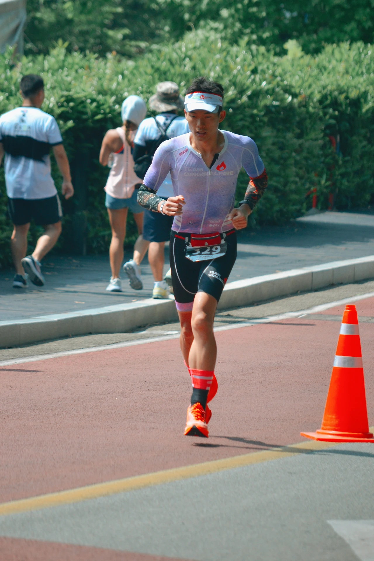 보급소 도착 직전 파스를 다리와 가슴과 팔에 충분히 뿌려주고 보급소 물과 얼음을 팔다리 가슴에 적셔주면 무척 시원했다. 순간 페이스가 1km당 10초 이상 빨라졌다. 다만, 말도 안 되도록 무더운 날씨로 1킬로 이상 지속되기 힘들기 때문에 보급소마다 루틴을 반복하듯 실행해 주었다