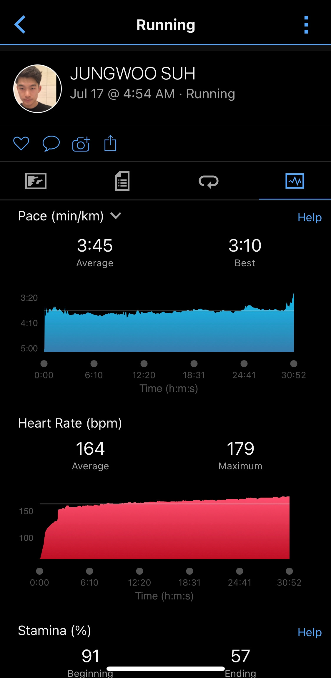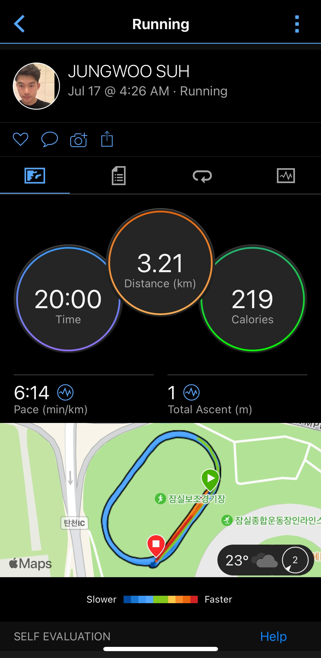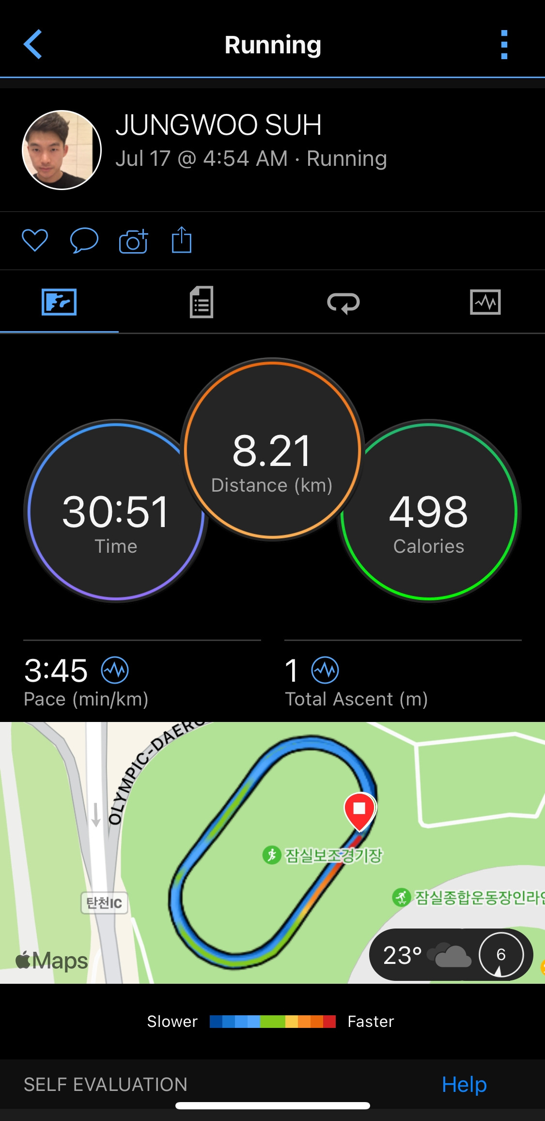 어제 롯데아쿠아슬론 대회를 마친 직후였기 때문에 오늘의 8,000m 지구력 페이스 달리기는 딱 좋은 흐름이었다. 다만 새벽임에도 높았던 습도 때문에 어렵지 않은 페이스였지만 다소 힘들게 느껴졌다. 좋은 분들과 함께 했던 덕분에 결국 기분 좋게 마칠 수 있었다. 역시 새벽 일찍 나오길 잘했다
