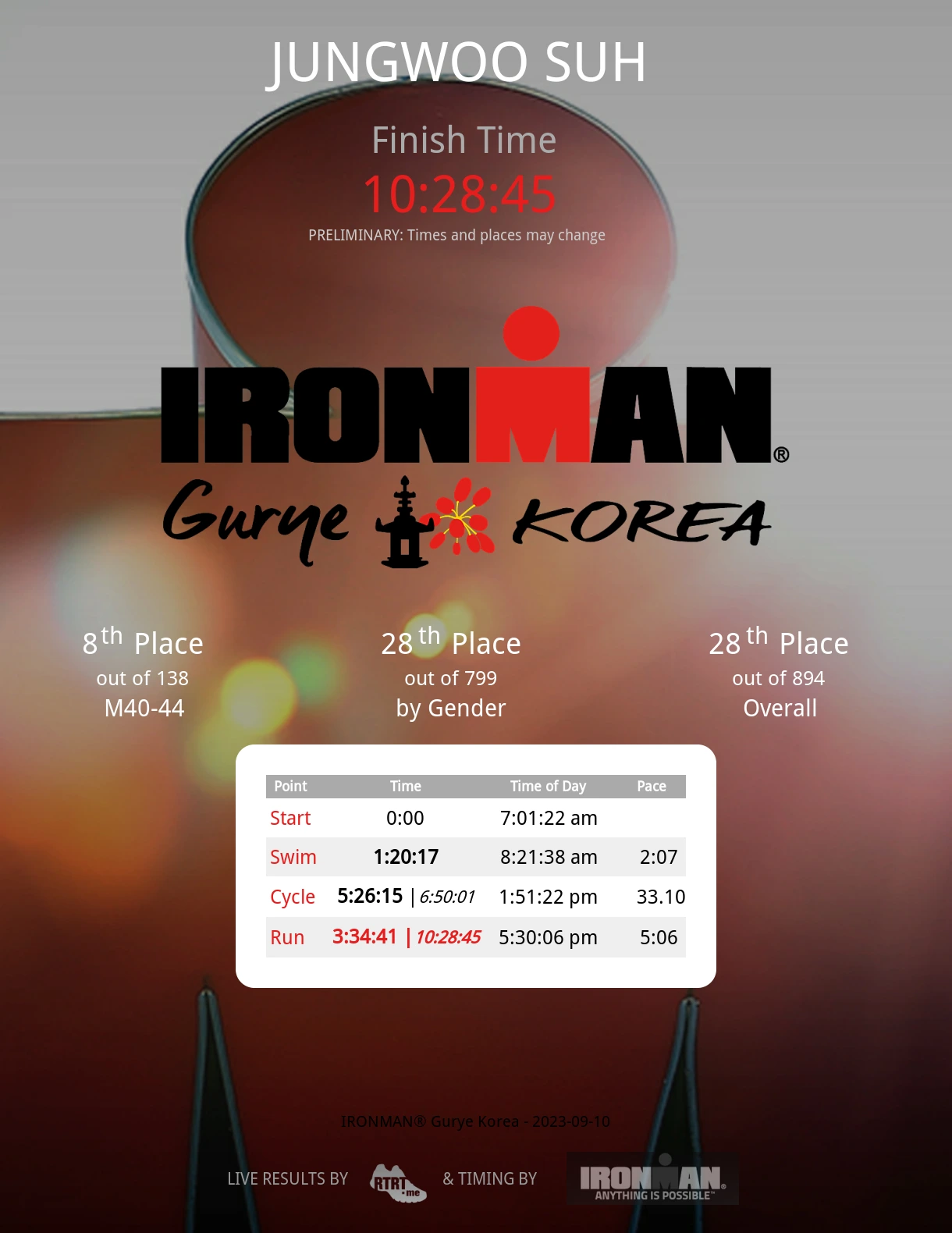 IRONMAN 대회가 열린 전남 구례는 지리산 둘레를 돌아 경남 산청의 반대편에 있는 곳이다. 구만제 지리산 호수에서 3.8km 수영을 하고, 섬진강 자전거길을 포함해 180.2km 자전거를 타고 끝으로 구례의 마을 길들을 반복해 42.2km 달리는 3종 대회이다. WTC 주관 IRONMAN 대회이고, 하와이 코나 월드챔피언쉽 출전권이 걸려있던 대회였기에 비싼 참가비에도 불구하고 국내외 많은 선수들이 참가하였다