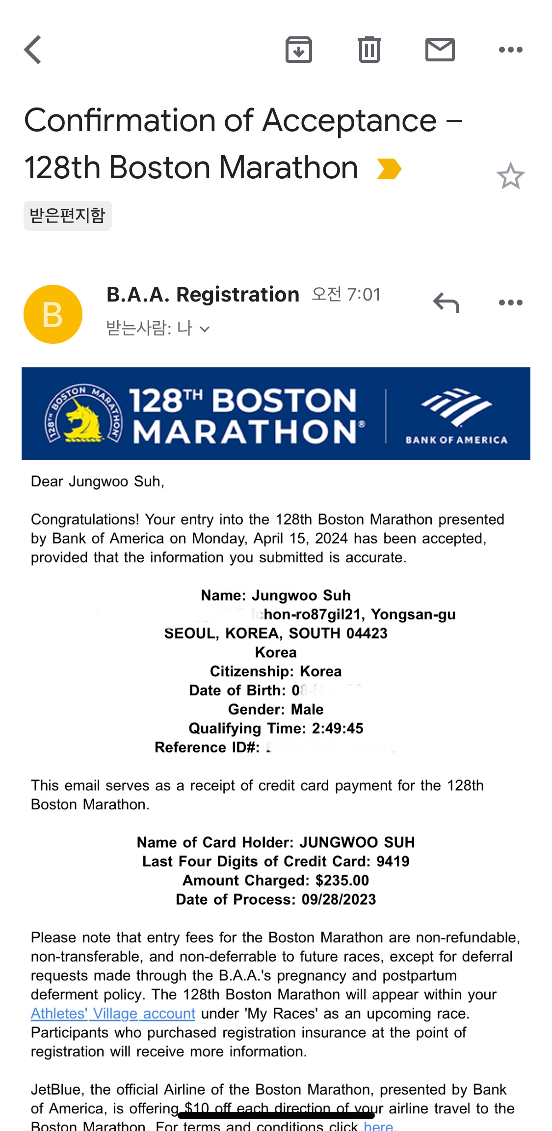2024년 보스톤 마라톤 참가 확정의 기쁨을 즐기며