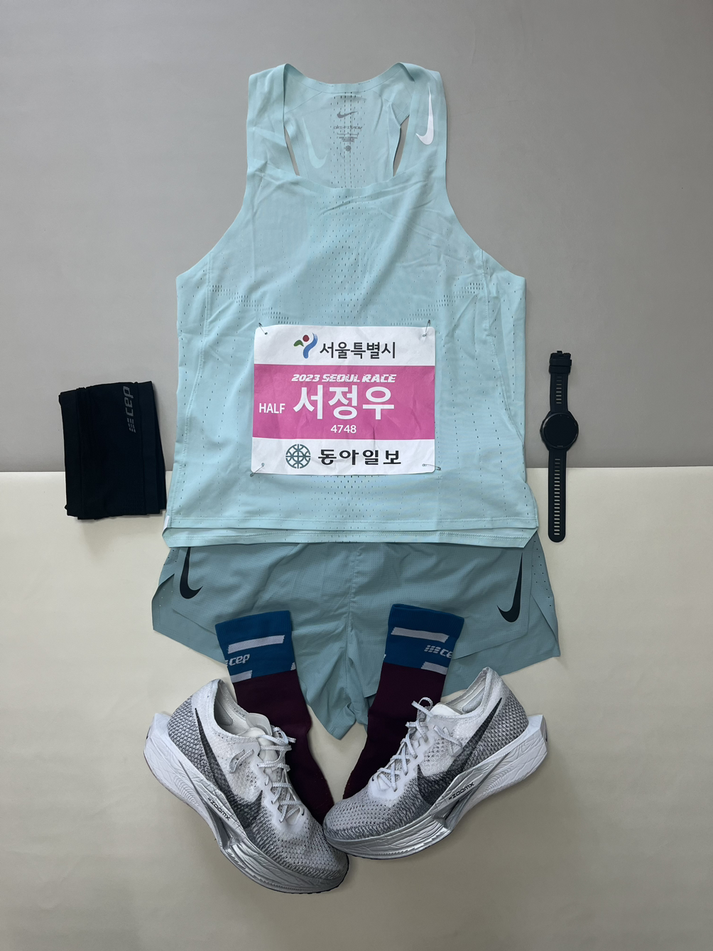 대회장에는 여유 있게 출발 2시간 전 도착하는 것이 좋지만 오늘 대회는 아주 비중 있는(?) 대회는 아닌 만큼 지하철을 타고 1시간 30분 이전인 6시 30분쯤 시청역에 도착하였다. 탈의실에서 겉옷을 탈의하고 대회 복장 위에 보온을 위해 우비를 걸쳤다. 여전히 오한과 발열감이 있고 코가 막히고 목이 부어 목소리가 맹맹했다. 몸 상태로 인한 경기력 저하가 우려되어 오늘은 평소와 다르게 엠플 철분제와 액상 마그네슘을 하나씩 먹었다. 안타깝게도 이런 것들까지 챙겨 먹었지만 결과적으로 목표했던 레이스를 펼칠 수는 없었다. 몸이 받쳐주지 못하니 백약이 무효했다
