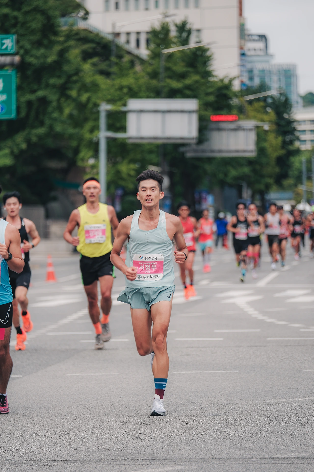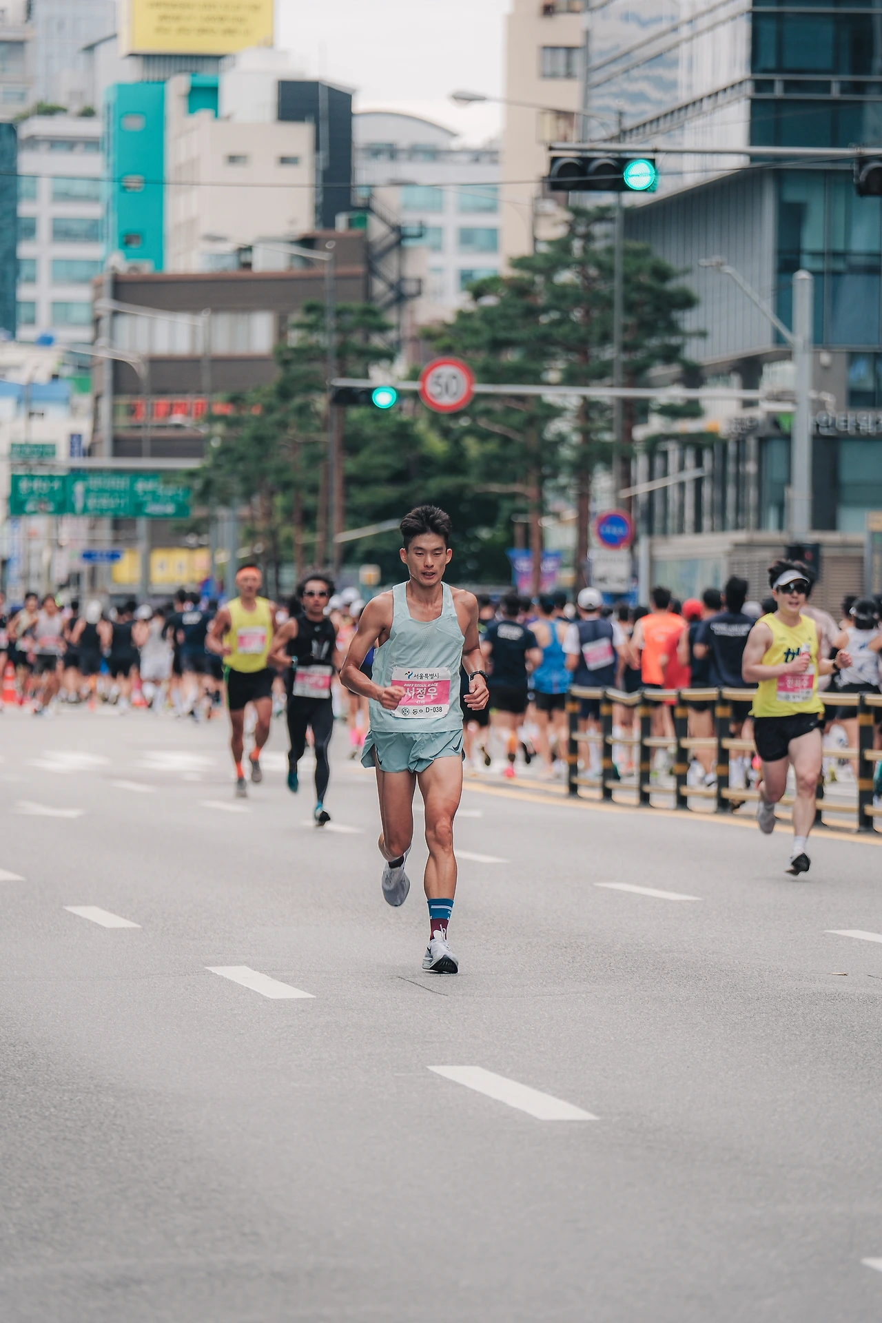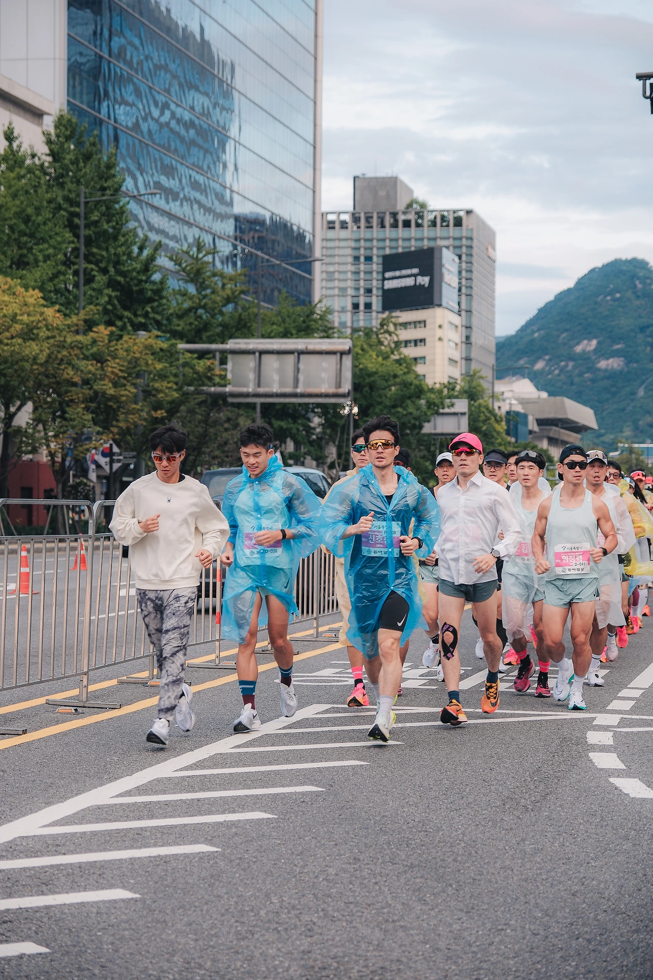웜업 후 한번 더 화장실을 가기 위해 프레스센터 지하에 먼저 내려갔는데 사람이 너무 많다. 하프 탈의실 쪽 화장실로 이동했지만 역시나 긴 줄이 이어져 있었다. 이번에는 더 멀리 광화문역 지하철 화장실로 내랴갔는데 여기도 사람이 많았다. 하는 수 없이 초조한 마음으로 기다렸다. 8시 정각 출발인데 7시 49분이 되어서야 화장실에 들어갈 수 있었다. 헐레벌떡 서둘러 일을 마치고 나와 스타트 라인으로 뛰어오니 이미 출발인원이 꽉 차 대기 중이었다. 기록을 위해서는 무조건 최대한 앞줄에서 출발해야 하기에 어쩔 수 없이 귀빈 단상 옆 빈틈으로 들어가려 했는데 진행을 맡은 경호 요원들이 막아선다. 일단은 들어가야 할 것 같아 말대꾸하지 않고 밀치고 들어가려 했는데 강하게 막는다. 어이쿠 안 되겠다. 약간 뒤쪽으로 돌아가 대기 중인 선수 분들에게 죄송하다 양해를 구하며 조금씩 앞으로 앞으로 이동하였다. 겨우 맨 앞에서 5~6번째 줄에 설 수 있었다. 앞 줄에 함프로님을 비롯해 함께 운동했던 분들이 주변에 보였다. 인사를 나누고, 우비를 벗어두고, 준비, 그리고 출발
