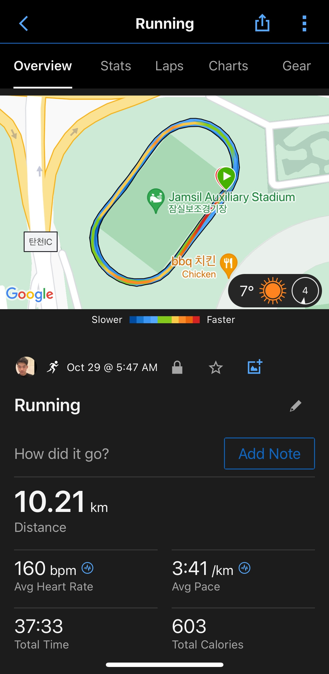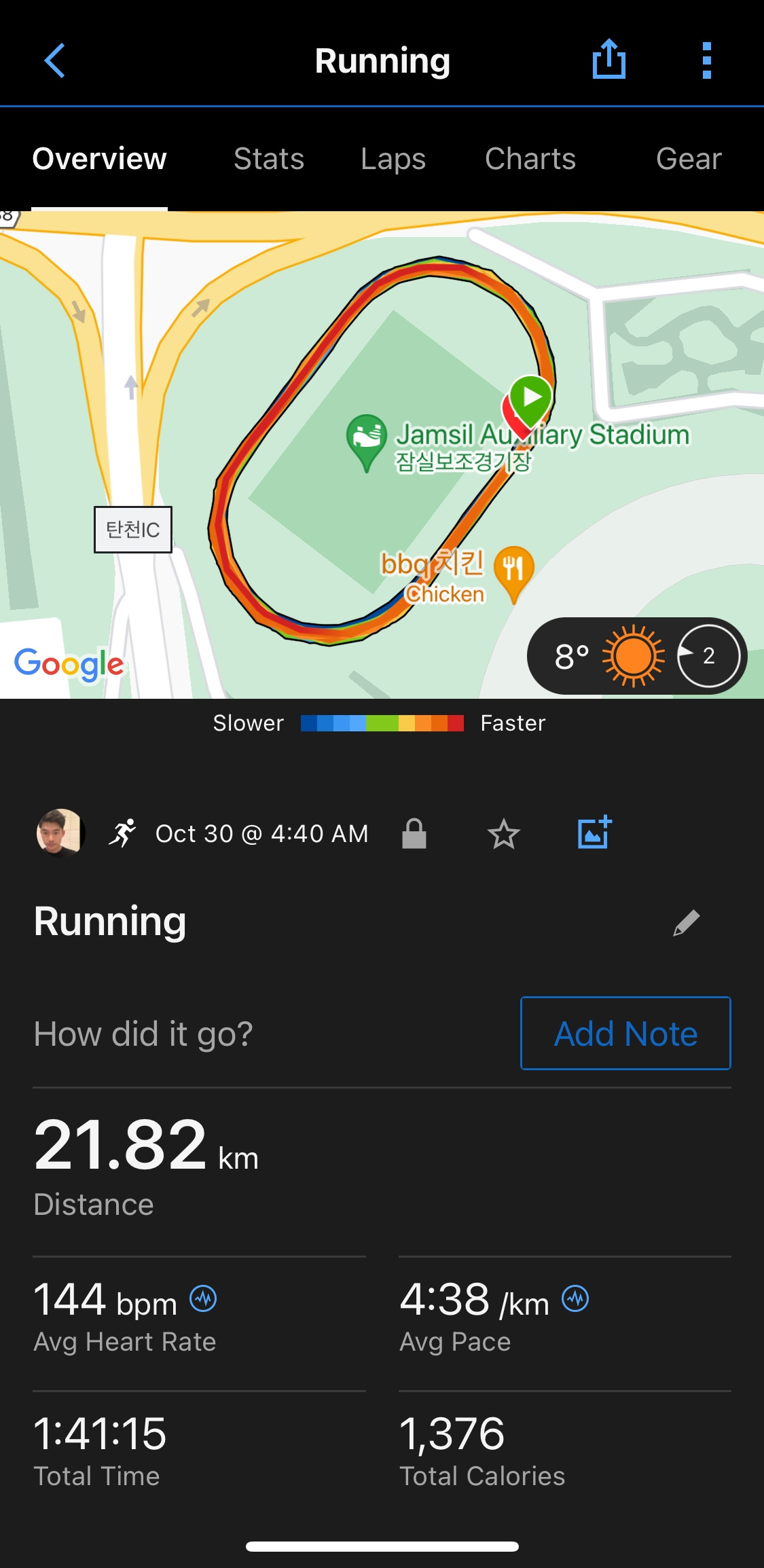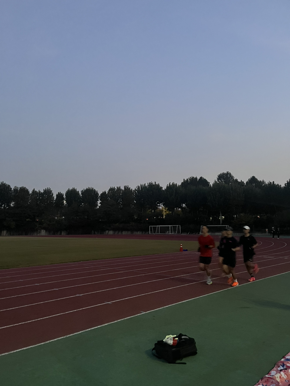 잠실보조경기장 트랙에서 하루는 새벽 4시 30분에 시작한다. 대회를 일주일 정도 앞둔 월요일, 마지막으로 90분 이상 길고 긴 조깅을 하는 날이다. 어제 일요일 새벽에는 최종 페이스 점검을 위한 10,000m 지속 달리기를 하였다