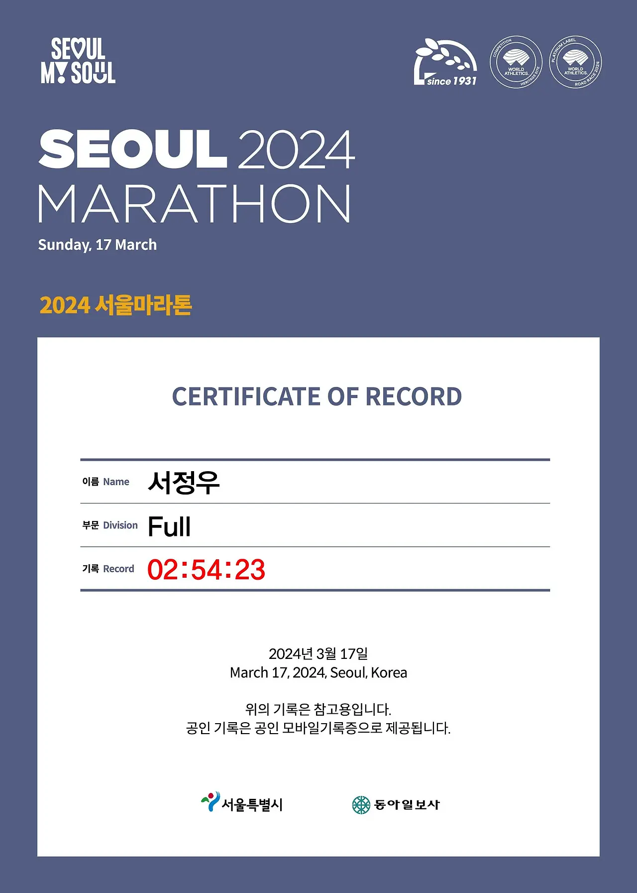 마라톤의 봄 축제는 이렇게 끝이 났다. 매 대회 복기를 할 때마다 반성하고 개선할 점들이 많지만 이번에는 체중 관리, 감량에 더 공을 들여볼 생각이다. 때마침 4월 전국생활체육축전 3종 대회에 서울 대표로 참가하게 되었기 때문에 책임감과 부담(?)을 가지고 절실히 체중과 실력 등 몸 상태를 준비해야 할 필요성이 큰 시점이다