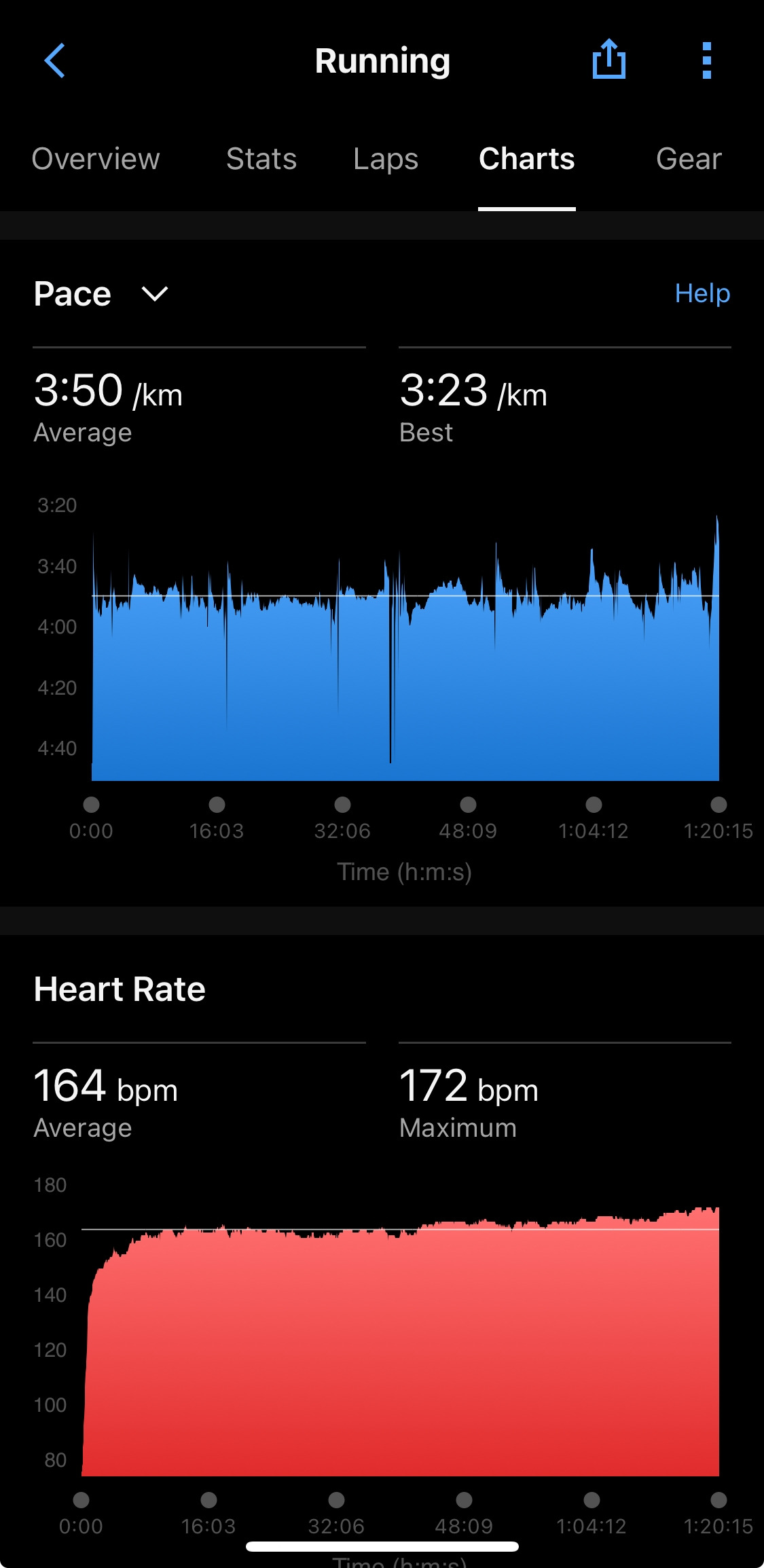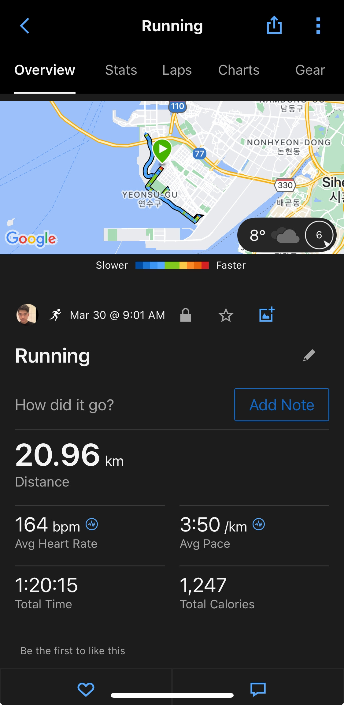 2주 전 서울마라톤 풀코스 때보다 약 1.5kg 정도 줄어든 체중으로 오늘의 하프 레이스를 달렸다. 아주 약간(?) 체중이 줄었을 뿐인데 훨씬 몸이 가볍다는 느낌이었다. 그래도 아직은 내가 가장 가벼웠던 2022년 가을과 2023년 봄 마라톤 시즌 때 비교했을 때 4kg 정도 무거운 상태라 예전 생각으로 초반부터 마음만 앞서는 페이스로 달릴 수는 없었다. 나도 내 상태를 알 수 없어 1km 당 3분 50초의 페이스로 초반부터 맞춰 달렸고, 다행히 이 정도 페이스는 오늘 충분히 감당되었다. 15km 이후 3분 45초 ~ 3분 48초 페이스 정도로 조금 올렸고, 때때로 불어오는 바람에 페이스가 오르락내리락하며 최종 3분 50초 페이스에 거의 딱 맞게 마쳤다