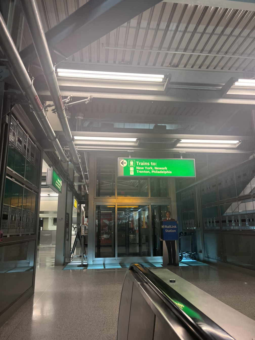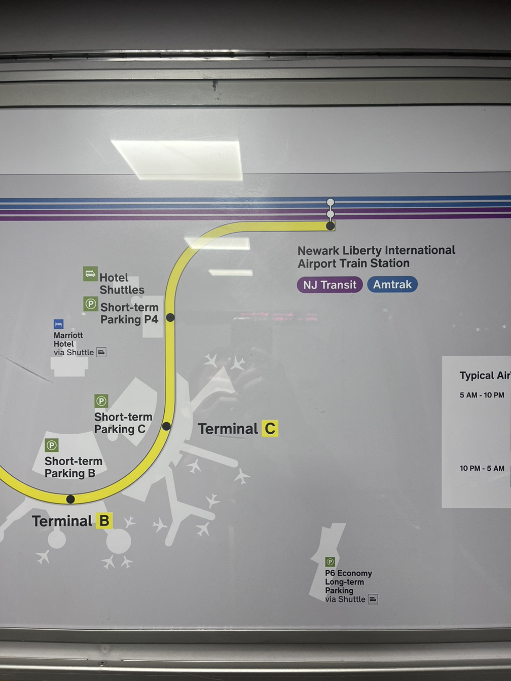 에어프레미아 탑승/도착이 이루어지는 뉴왁 공항 터미널 B에서 트레인 스테이션으로 이동하기 위해서는 에어 트레인 Air Train이라는 공항 내 순환열차를 이용한다. 무료이다. 터미널 B에서 트레인스테이션으로 가기 위해서는 터미널 C 정거장과 P4(4번 주차장) 정거장을 거쳐서 가는데, 에어트레인마다 어떤 건 터미널 C까지만 가고 어떤 건 P4까지만 가는 것들도 있다. 플랫폼에 있는 직원에게 트레인 스테이션으로 간다고 말하면 이번에 타면 될지 다음에 타면 될지 친절하게 알려준다