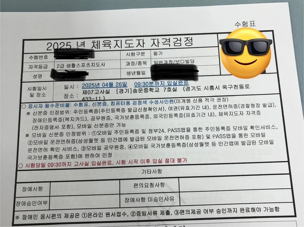사진처럼 2급 생활스포츠지도사 필기시험을 보고 왔습니다.