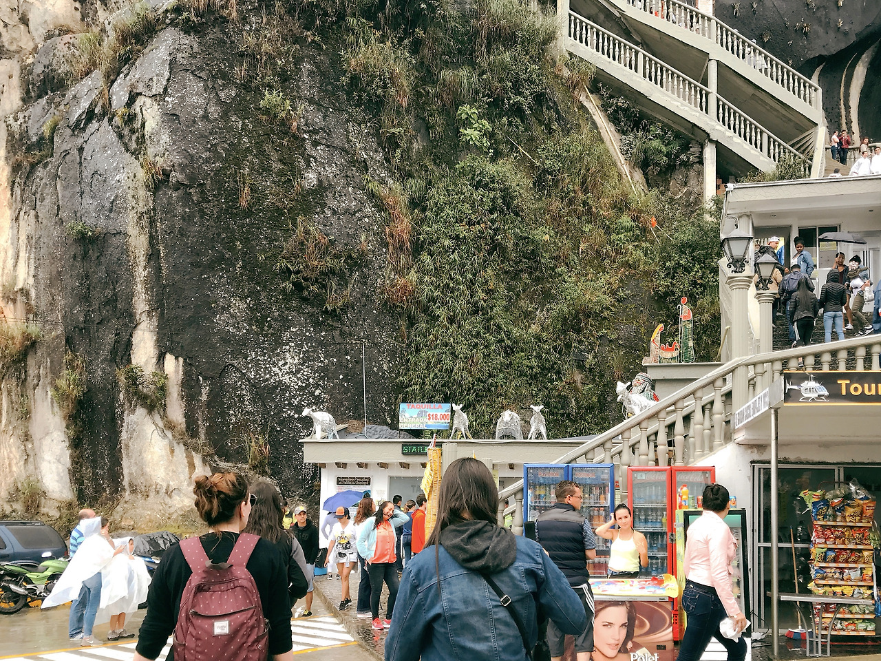 정상은 여느 전망대가 그렇듯 사람들로 북적였다. 기념품이나 간식을 판매하는 매점 앞은 무언가를 사달라며 떼를 쓰는 아이들과, 벌컥벌컥 물을 들이켜며 목을 축이는 사람들로 가득했다. 추적추적 내리는 비에도 아랑곳하지 않고 기타를 치며 노래를 부르는 이도 있었다. 엘 뻬뇰 정상에서 보는 전망이 콜롬비아에서는 제일이라던데, 아니나 다를까 난간 주변은 바위를 둘러싸고 있는 인공호수를 배경 삼아 사진을 찍는 사람들로 발 디딜 틈이 없었다.