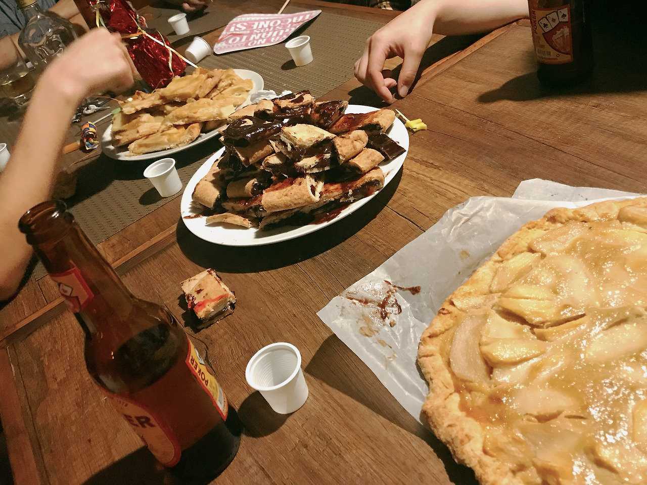 투숙객이 없는 건지 시끌벅적하게 주방을 울리는 무리를 저지하는 이는 없었다. 아니, 알고 보니 호스텔 호스트들과 그 친구들이 총출동한 파티였다. 엠마는 할머니의 비법을 따라 만들었다는 커다란 애플파이와 초코 시럽이 잔뜩 뿌려진 빵을 내어왔다. 한 푼 두 푼 모아 산 술도 테이블 위로 올려졌다.