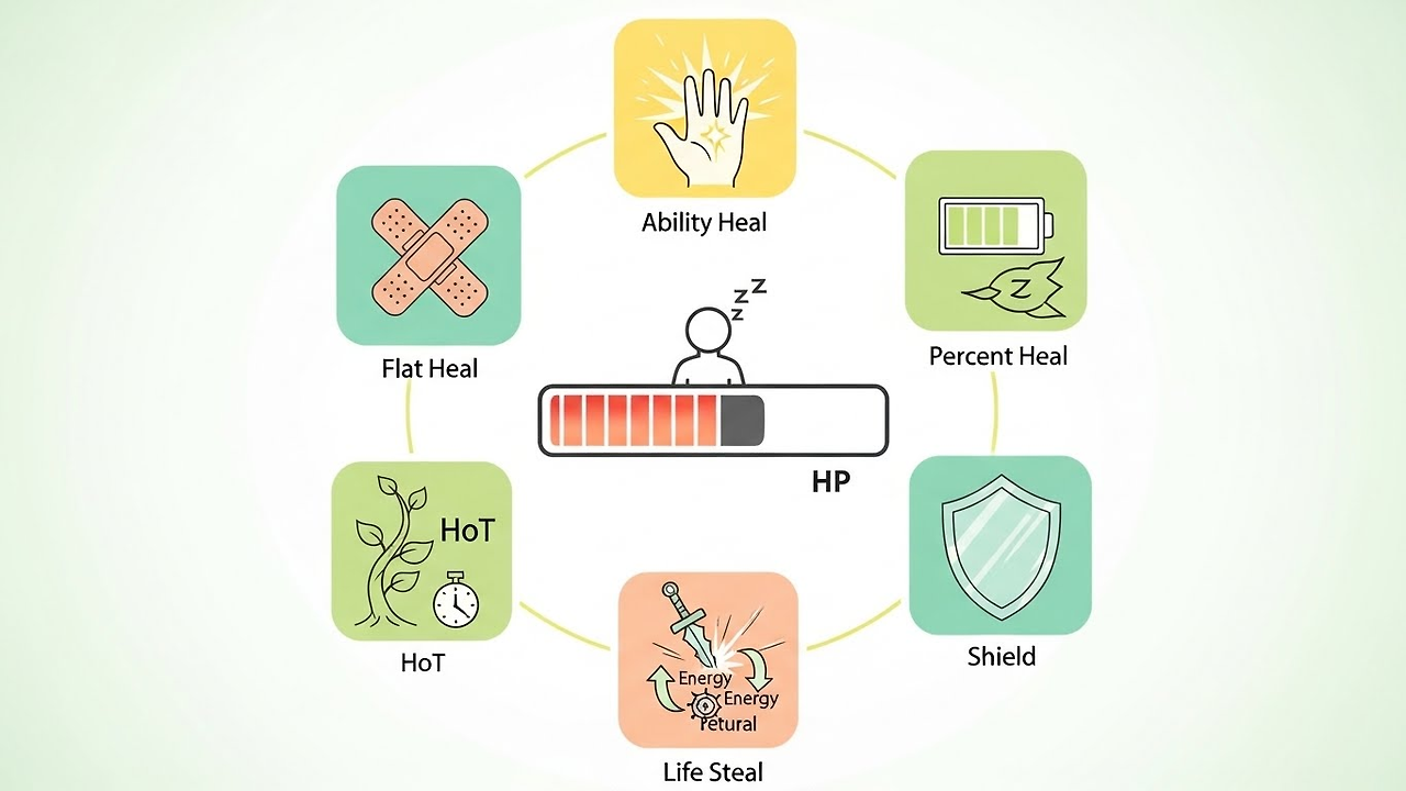 "고정 힐은 안정적이지만 한계가 있어. 능력치 기반 힐은 상대에 따라 달라지거든. 퍼센트 힐은 당신이 깊이 다쳤을 때 더 효과적일 거야.