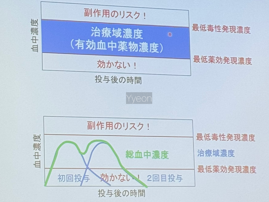 사진의 그래프처럼 약의 효과가 단시간에 피크를 찍고 롤러코스터처럼 내려오기 때문이고 (파란색) 그 틈에 바이러스들이 다시 활성화되기 쉽다.