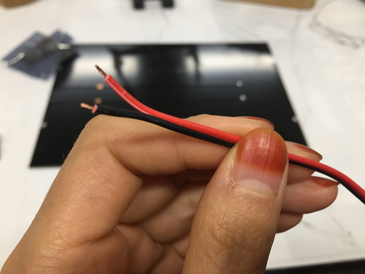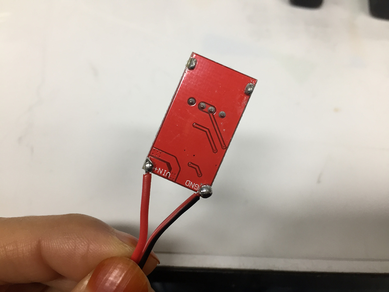 보통 밝은 색깔이 +라고 한다. 위에 납땜한 곳에 인두기로 녹여서 선을 밀어넣는다. 아 선 끝에는 피복을 벗겼다.