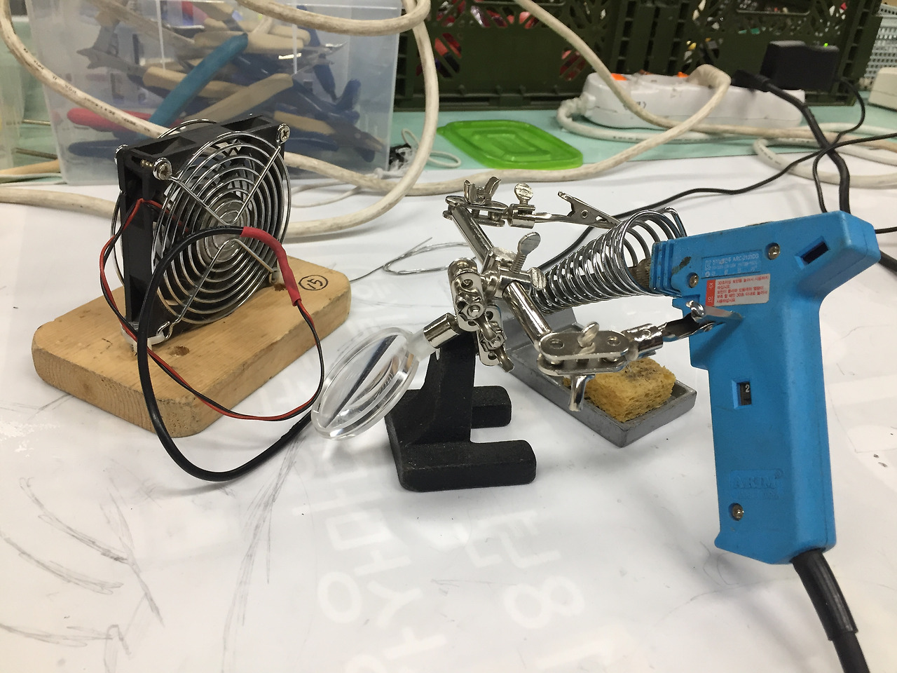 납땜을 할 때 납이 녹으면서 연기가 나는데 몸에 좋지 않다. 팬을 틀어서 그 연기를 날려야 한다. 인두기가 뜨겁기 때문에 돋보기나 고정기가 필요하다. 납은 금방 굳는다. 인두기 밑에 있는 스폰지는 녹은 납을 닦을 때 쓴다. 녹지 않는 특수한 스폰지(신기)