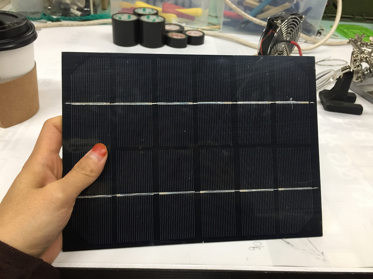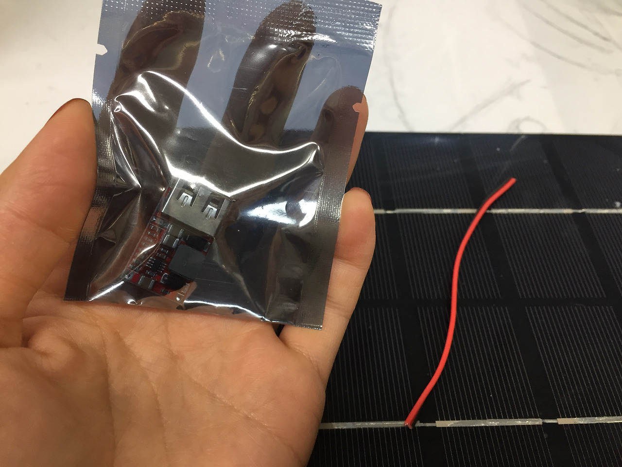 - 오늘 만드는 태양광 충전기는 5와트짜리다. 이것으로 핸드폰을 충분히 충전하기는 어렵다. 이 태양광 패널은 시중에서 25,000원 정도에 팔고 있다. 태양광 패널은 얇고 가벼울수록 비싸다. 와트 숫자가 높을수록 에너지 효율이 높다. 7W, 14W 정도 되면 쓸만하다. 시중에 지갑처럼 접어서 쓸 수 있는 것들도 많이 나와있다. 시거잭을 꼽으면 12 볼트도 쓸 수 있다. 12 볼트면 납땜을 하거나 글루건을 쓸 수 있는 정도이다.