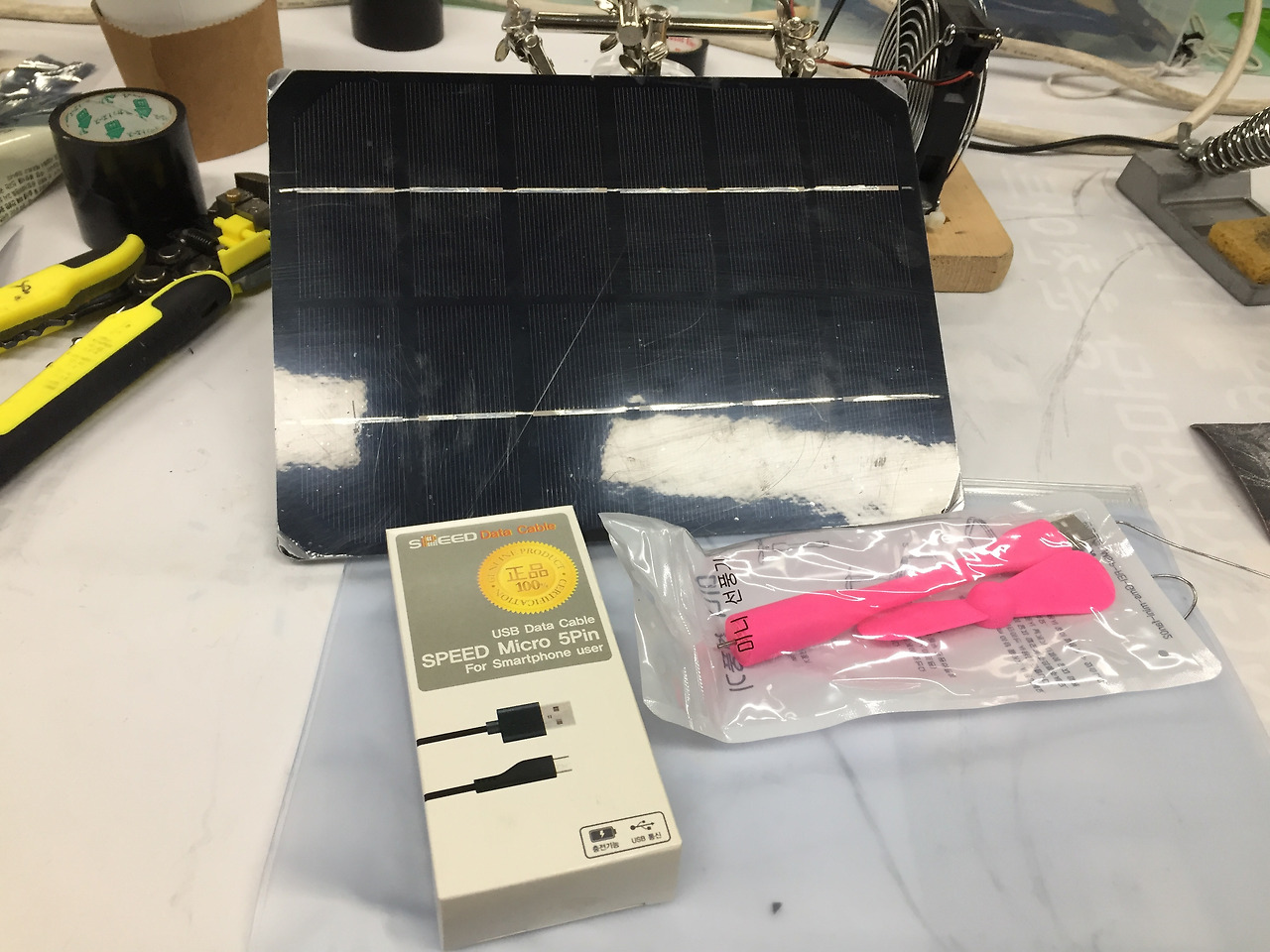 25-30 정도 기울인 상태에서 태양열이 가장 효율적이라서 각도를 줄 수 있는 받침도 달았다. USB포트를 절연테이프가 막지 않도록 조심.