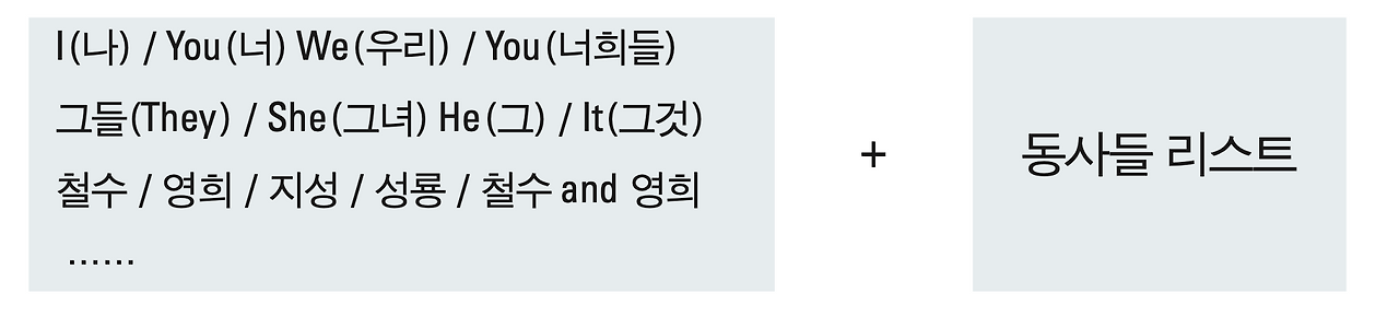 I(나) / You(너) / We(우리) / 너희들(You) / 그들(They) / She(그녀) / He( 그) / It(그것) / 철수 / 영희 / 지성 / 성룡 / 철수 and 영희 등.......