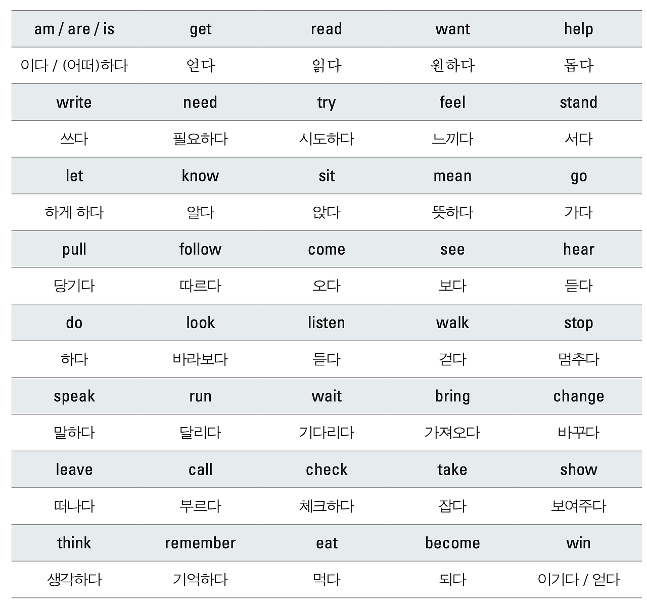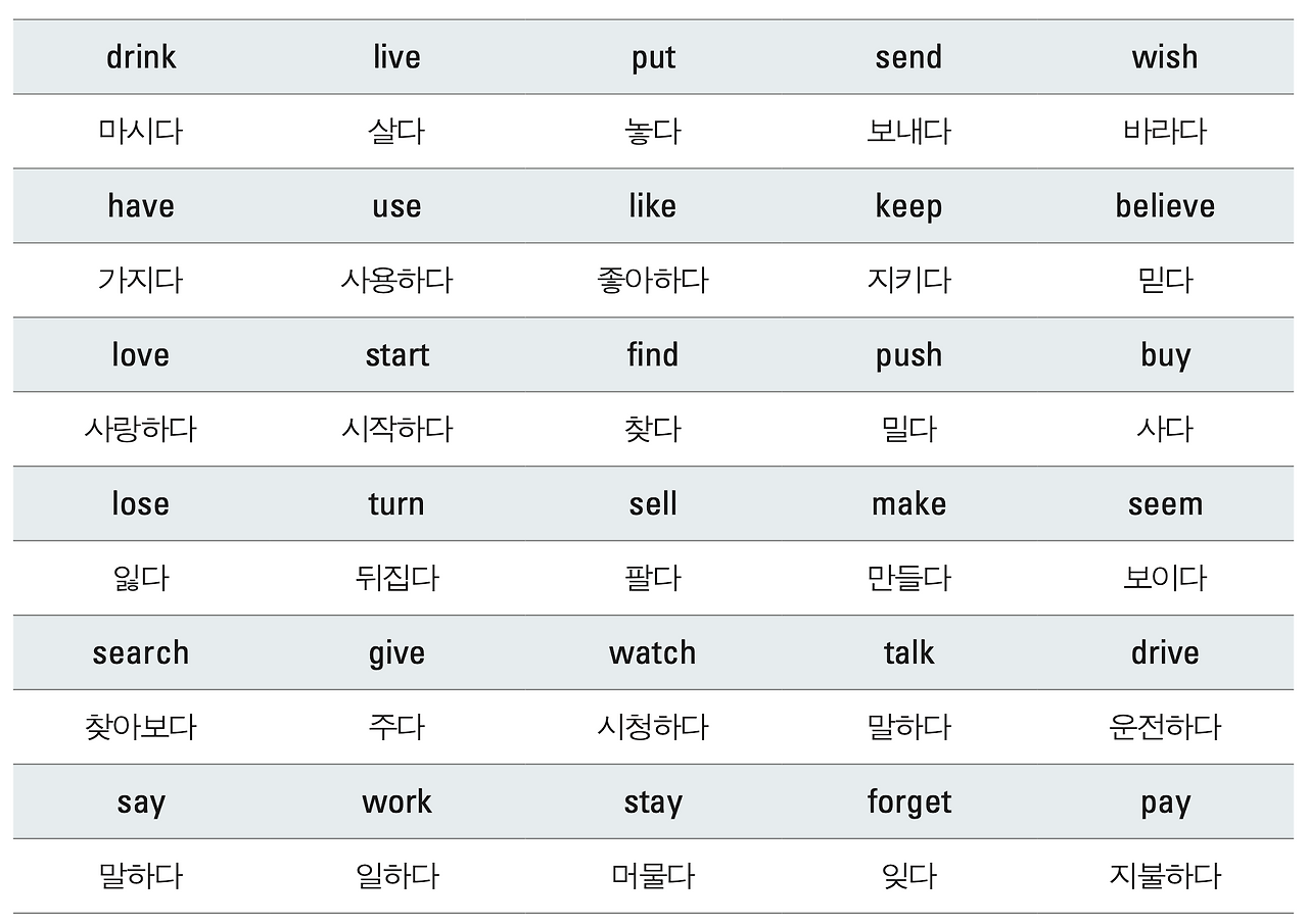 영어가 익숙하지 않다면 최대한 우리말 주어를 사용하자. 다음의 표는 일상생활에서 꼭 알아야 하는 70개의 정말 쉬운 영어 동사들이다.