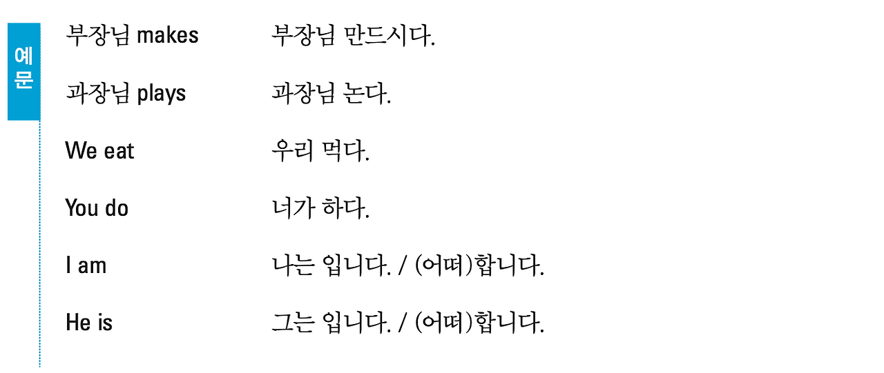 혼자 연습할 때, 각 동사에 대하여 위 주어 후보군 하나하나를 매치 시켜서 연습해보라. 다음과 같이 말이다.