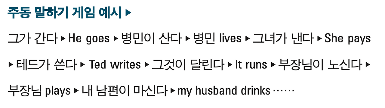 당신이 친구들과 함께 영어를 공부한다면, 이렇게 게임을 할 수도 있다. 한 사람이 “아이작 달린다”라고 하면 5초 안에 “아이작 runs” 하고 외치는 게임이다. 이때 한 사람씩 돌아가면서 연습한다. 이 게임을 통해 ‘주어 + 동사’가 더욱 입에 잘 달라붙을 것이다. 특별히 ‘나’, ‘너’가 아닌 단수 주어의 경우, 동사 끝에 ‘s’를 붙이는 게 좀 더 자연스러울 것이다. 동사 끝에 ‘s’ 붙이는 걸 틀린다면 벌칙을 받는다.