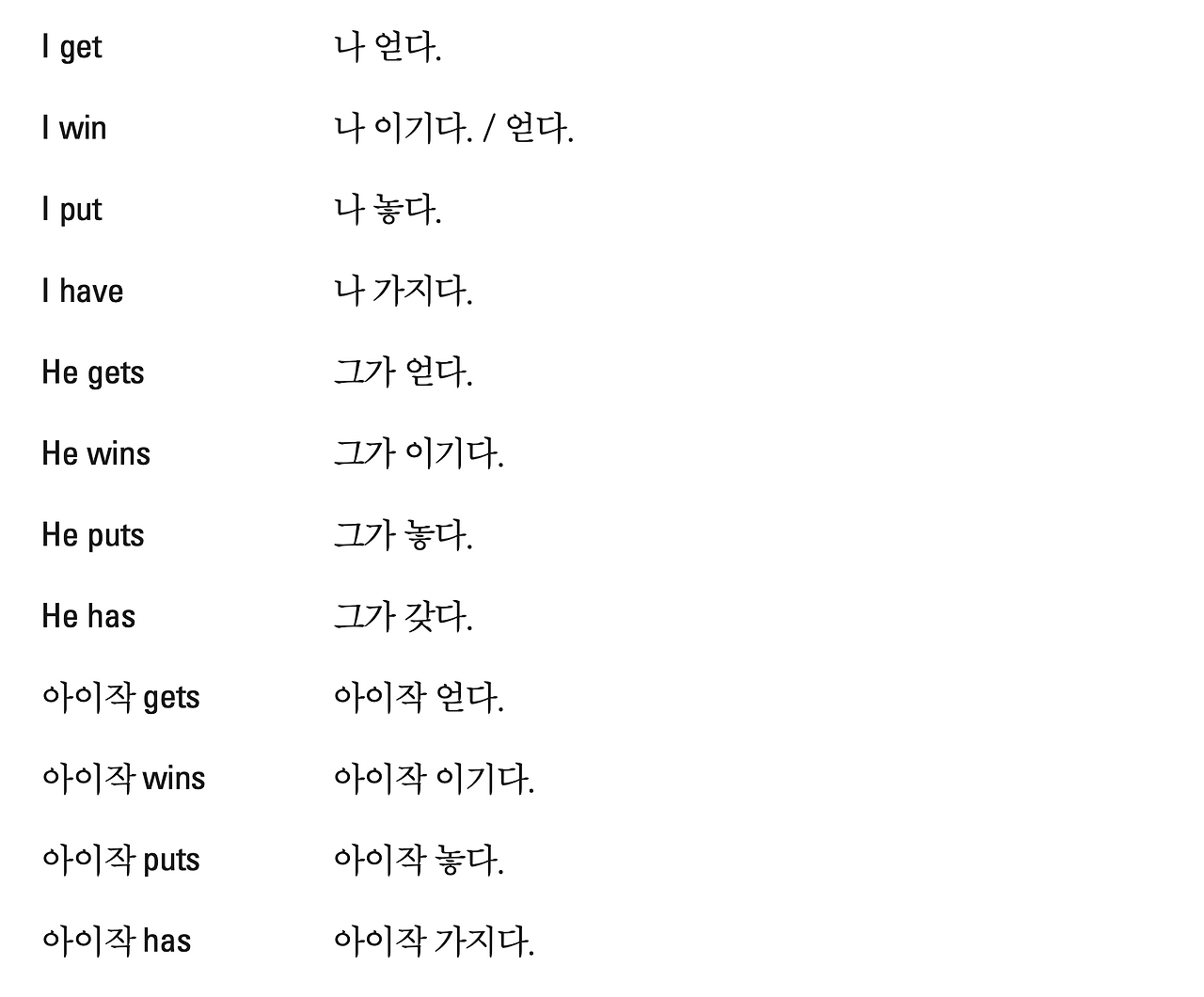 또한 주어 하나를 고정하고 동사들을 하나하나 매치시켜서 연습할 수 있다. 다음과 같이 말이다.