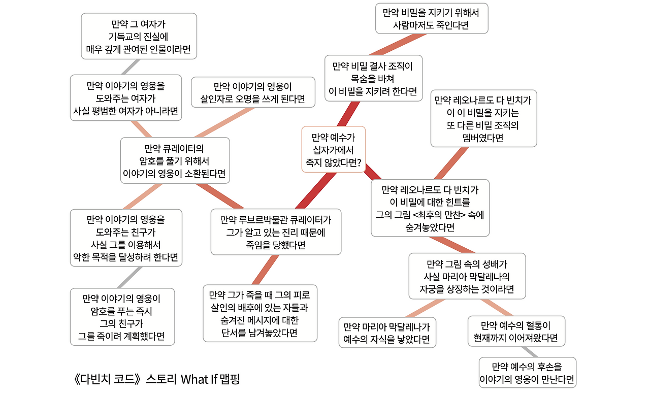 어떻게 하면 당신의 창의성을 극대화시키는 What If 질문을 훈련할 수 있을까? 매우 효과적인 방법 하나를 소개하겠다. 마인드 맵핑(Mind Mapping)은 정보(생각, 아이디어, 키워드, 그림 등)를 시각적·유기적으로 조직하는 다이어그램인데, 뇌의 잠재력을 높이는 매우 효과적인 방법이다. 종이 한 장을 준비하고 그 중심에 주제가 되는 핵심 개념을 쓰고 그 개념을 중심으로 자유롭게 생각된 개념들을 연결시켜 생각을 확장해 나가면 된다. 이 마인드 맵핑을 활용해서 What If 질문을 훈련할 수 있다. 이 훈련을 What If 맵핑이라고 부르자. 앞서 언급한 소설 《다빈치 코드》의 내용을 What If 맵핑을 통해 나타내보자.