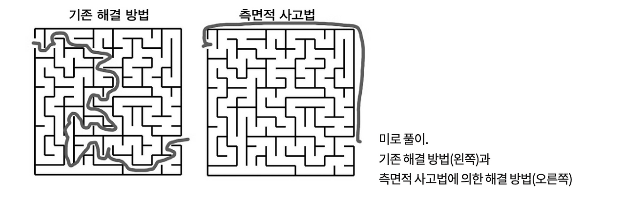 세 번째, 측면적 사고법은 쉽게 말해서 우리가 기존에 알고 있는 상식·이론·통념 등을 거부하고 새로운 관점과 방향으로 생각을 전개하는 방법이다. 흔히 말하는 낯설게 바라보기가 측면적 사고법이다. 측면적 사고법을 통해 당신은 이미 알고 있는 대상을 모르는 것처럼 낯설게 바라보고 이로써 기존의 표준과는 완전히 다른 새로운 가능성을 모색할 수 있다. 예컨대 다음의 그림처럼 미로 문제가 있을 때, 측면적 사고법은 미로 속에 들어가 해결책을 찾는 기존의 방식을 거부하고 미로 밖에서 해결책을 찾으려는 사고법이다.