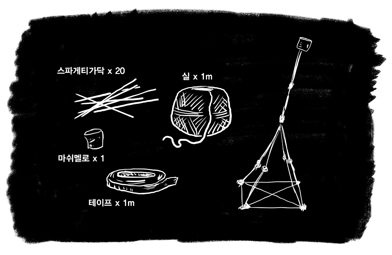 아이들은 유치원에서 늘 하던 방식 대로 회의하지도 주도권을 놓고 다투지도 않았다.아이들은 마시멜로를 스파게티 기둥에 꽂고는 레고놀이를 하듯 기둥이 쓰러지지 않도록 보수하는 방식으로 협력했다.