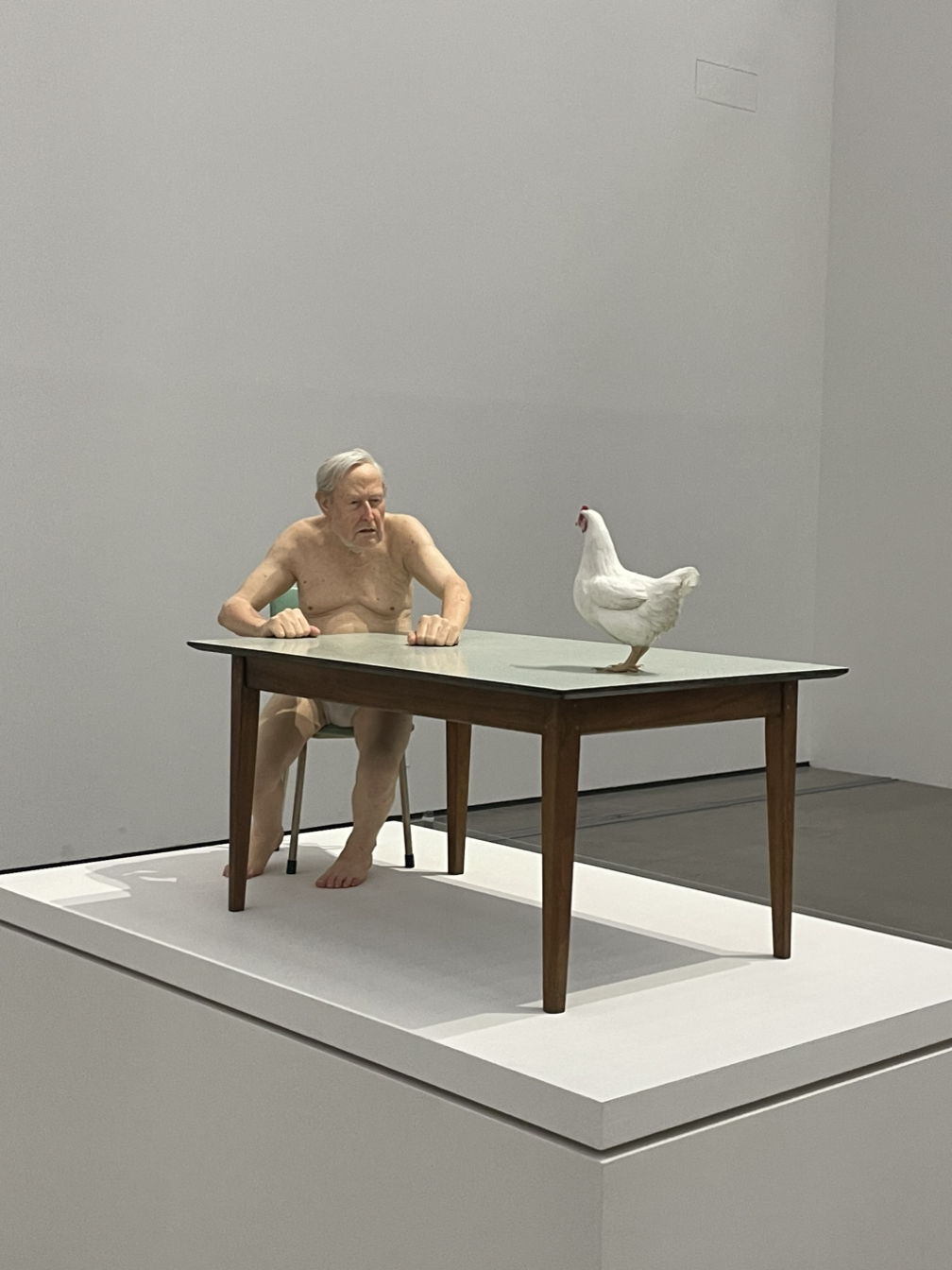 의자와 식탁 모두 초록색이라는 점도 흥미롭다. 둘은 결국 저 초록색 단상 위에서 마주했다. 죽어야 하는 곳 위에서 산 닭, 그리고 살아감을 위한 식탁의자에 앉은 죽음에 가까워진 노인. 노인은 초록이라는 단상 위에서 자신과 대비되는 기세 좋은 암탉을 보며 자연히 죽음을 마주했으리라.