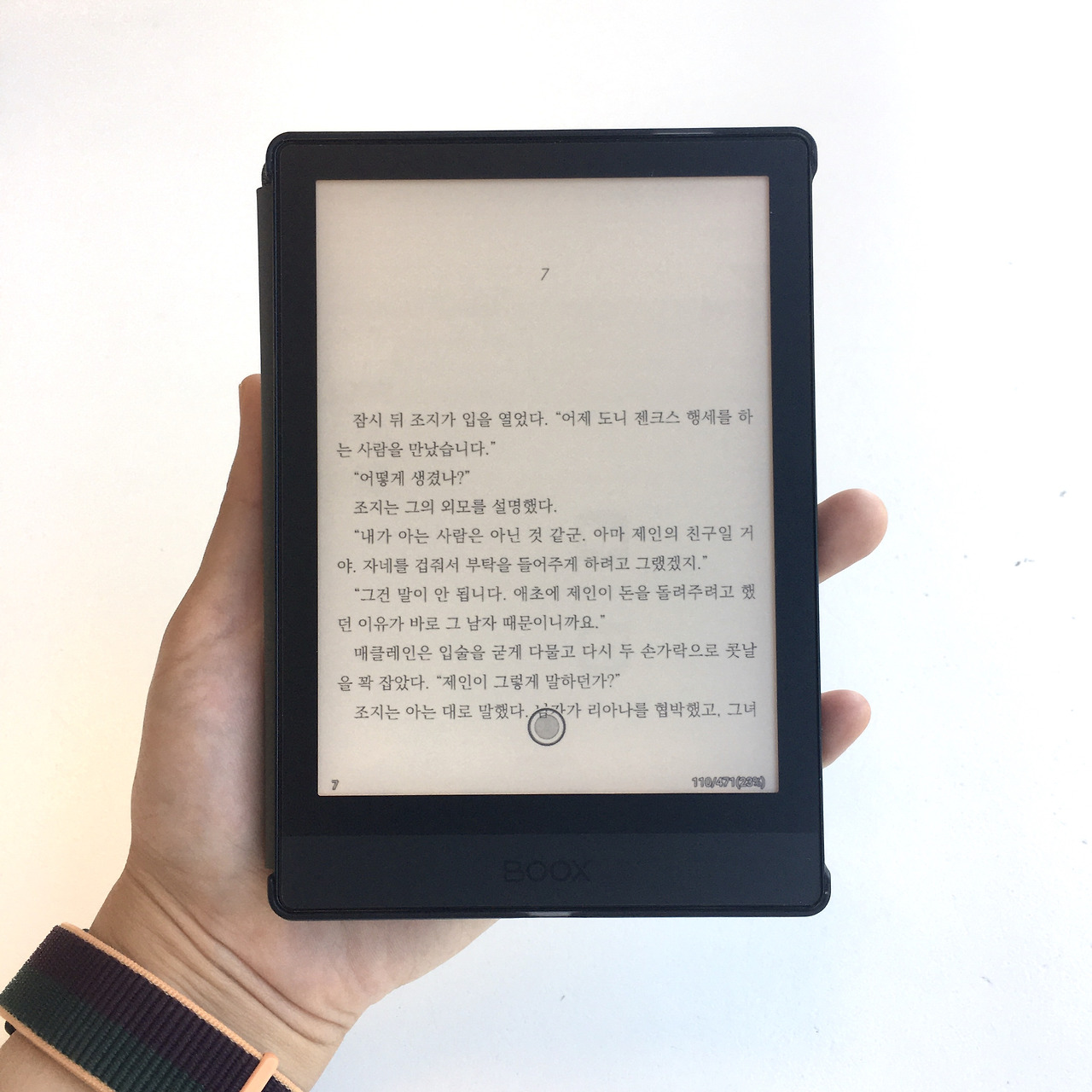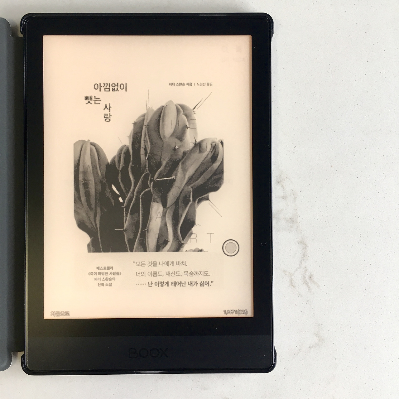 종이책을 선호하지만 국제 배송비가 부담스러웠고 이사 다닐 때 무척 짐이 된다는 걸 깨달았기 때문에 이번에는 이북 리더기라는 신문물을 사용해보기로 했다. 이북리더기는 오랜 고민 끝에 오닉스 포크3으로 구입했는데 타사 제품은 호환성이 떨어지고 전자도서관 이용이 불가능해 결국 포크3으로 안착하게 되었다. 어렵지 않게 초기 세팅을 마칠 수 있었고 사진은 서울시교육청 전자도서관에서 대출한 피터 스완슨의 『아낌없이 뺏는 사랑』을 펼친 모습.