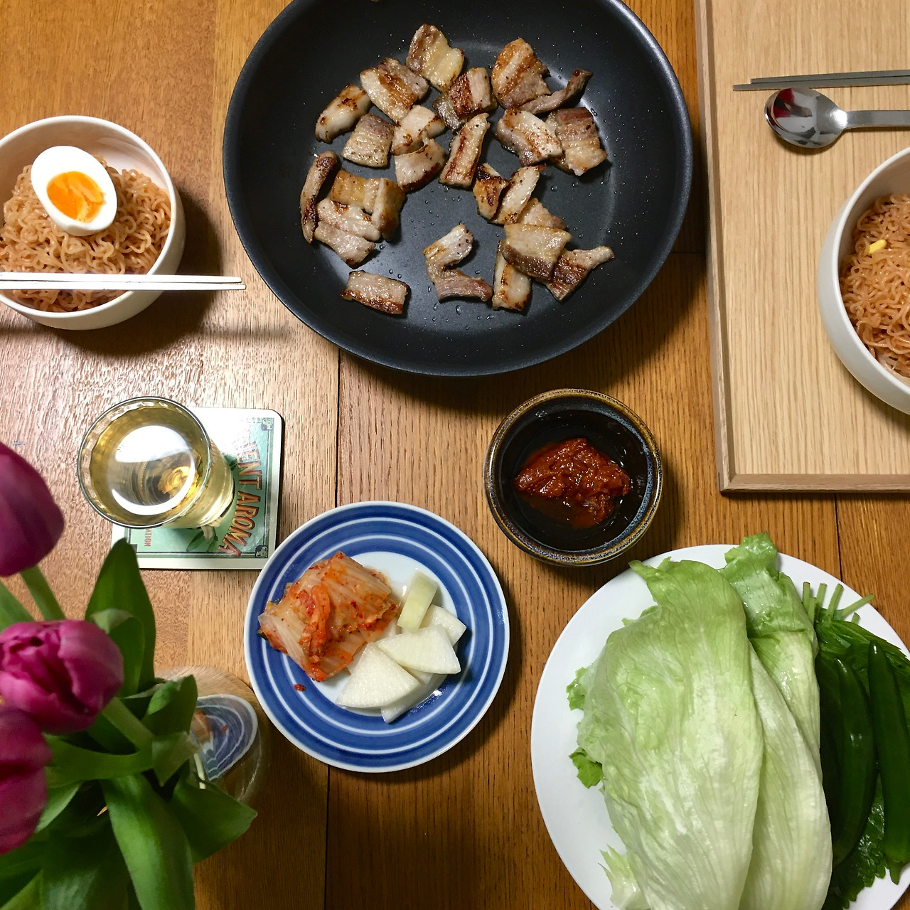 친구들을 초대해 첫 집들이를 마쳤다. 친구 둘 불렀을 뿐인데 우왕좌왕하는 나 너모 어이없었고 한번 해보니 그동안 밥 먹으러 오라고 자주 불러준 친구들에게 고마운 마음이 들었다. 다음엔 더 맛있는 거 해줘야지. 집들이 날은 얼마나 정신이 없던지 사진 한 장 못 찍었고 위 사진은 요즘 밀고 있는 삼겹살+비빔면 콤보를 친구에게 소개(?)하기 위해 초대한 날.