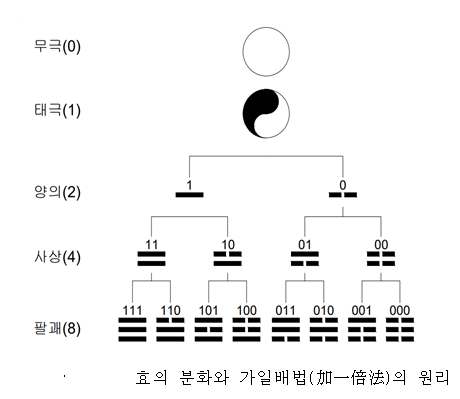 이것을 수리로 표현하면 1-2-4-8이 되고 더 나아가면 16-32-64로 이어지면서 64괘로 확장이 됩니다. 잘 보면 2진법 수리가 드러나는 것을 알 수가 있죠. 주역에서는 이 수리적 원리를 가일배법(加一倍法)이라 하고 있습니다.