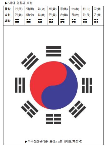 주역(周易)은 우주삼라만상을 「건(乾)·태(兌)·리(離)·진(震)·손(巽)·감(坎)·간(艮)·곤(坤)」이라는 8개의 괘상으로 간략화시키고 있습니다. 지구상의 만물을 8개로 범주화(category)한 것이죠. 이것은 「전체와 부분」이라는 하이젠베르크의 원리로 설명할 수 있습니다. 전체 속에 부분이 있고 부분은 곧 전체와 같다는 이론입니다. 나의 일부분인 유전자 세포 하나를 떼어 내 나라고 하는 전체를 똑같이 복제하는 현대 과학도 가능한 이론입니다. 신라의 의상대사는 이것을 일중다 다중일(一中多 多中一)이라고 간단하게 설명하고 있습니다. 주역은 계사전에서 '역여천지준(易與天地準)'이라 하여 '역(易)은 천지(天地)와 똑같다'라고 정의를 내리고 있습니다. 지구는 곧 우주의 축약인 셈이죠. 우리는 지구를 앎으로써 우주를 이해할 수가 있습니다.
