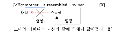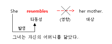 ►resemble은 She를 주어로, her mother를 목적어로 갖는 타동사이지만 주어가 실행한 동작이 아니라 상태를 의미한다. 그러므로 목적어인 her mother에게는 아무런 영향을 주지 못한다. 당연히 수동태 문장은 성립될 수 없다. 대상에 대하여 타격을 가하든 감동을 주든 간에 어떠한 형태로든 영향을 주는 타동적 의미가 있어야 수동태 문장이 가능하기 때문이다.