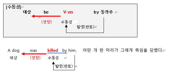 수동태: 수동태란 주어가 실행한 동사의 타동성 영향을 받은 대상(목적어)의 입장에서 동작을 받았음을 표현하는 어법이다. 이 경우 목적어가 화제의 중심자리인 주어자리에 오게 된다.